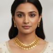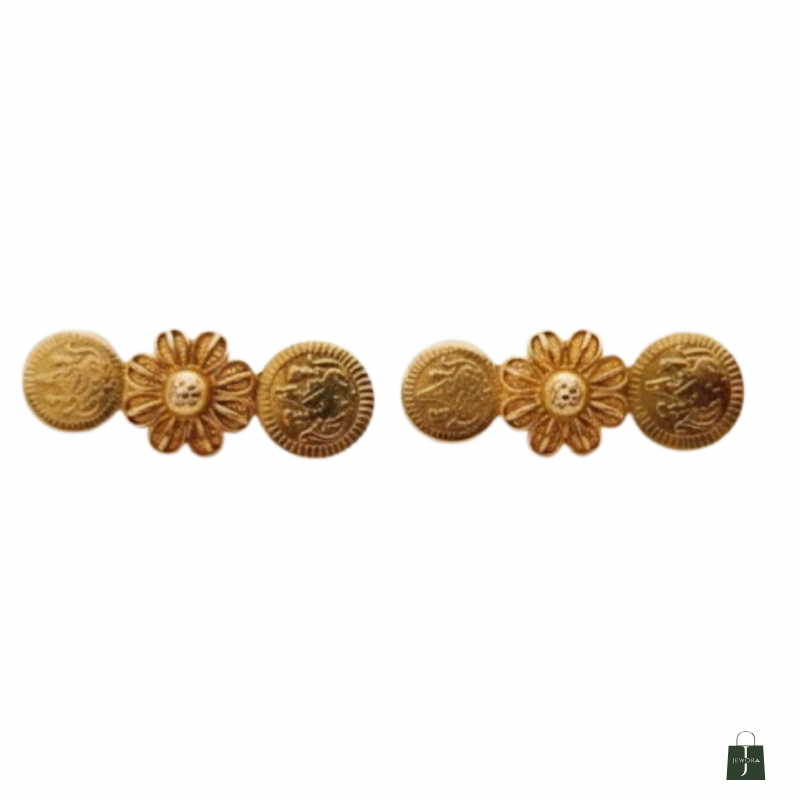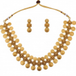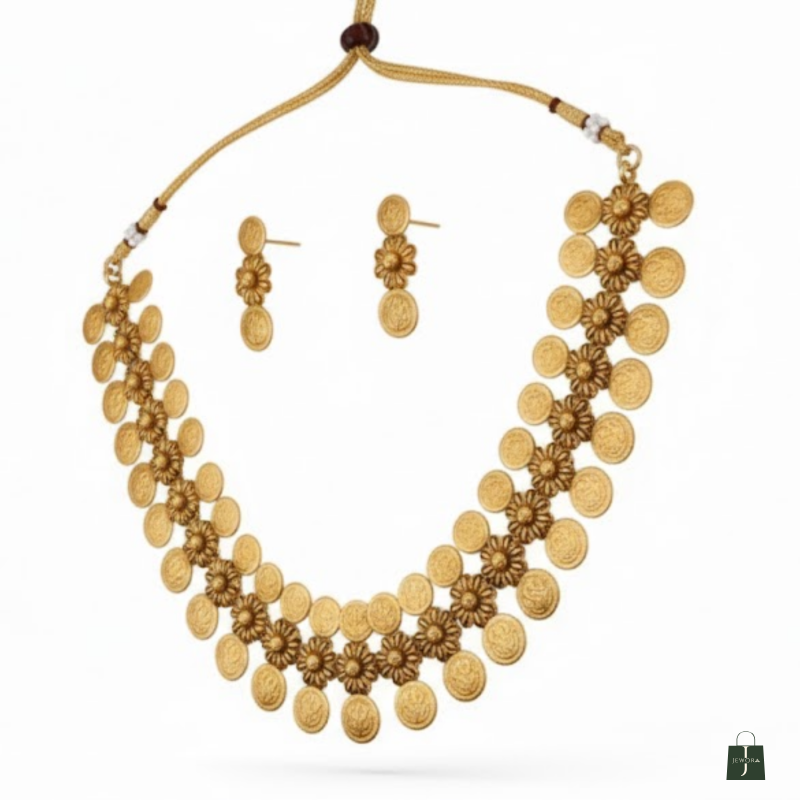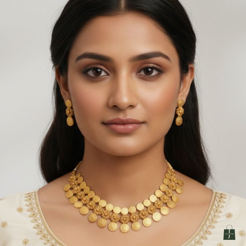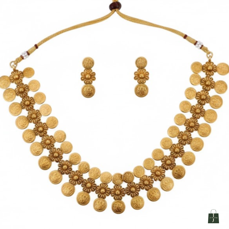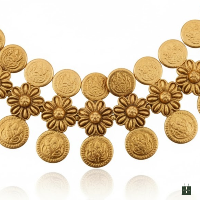 Embrace timeless heritage with this Antique Gold Coin Choker Necklace Set, inspired by traditional South Indian temple jewellery. The design features intricate floral engravings and layered coin motifs that symbolise prosperity and grace. With a refined antique finish and matching stud earrings, this set beautifully complements sarees, lehengas, and festive attire — adding instant royal charm to any look.
