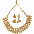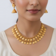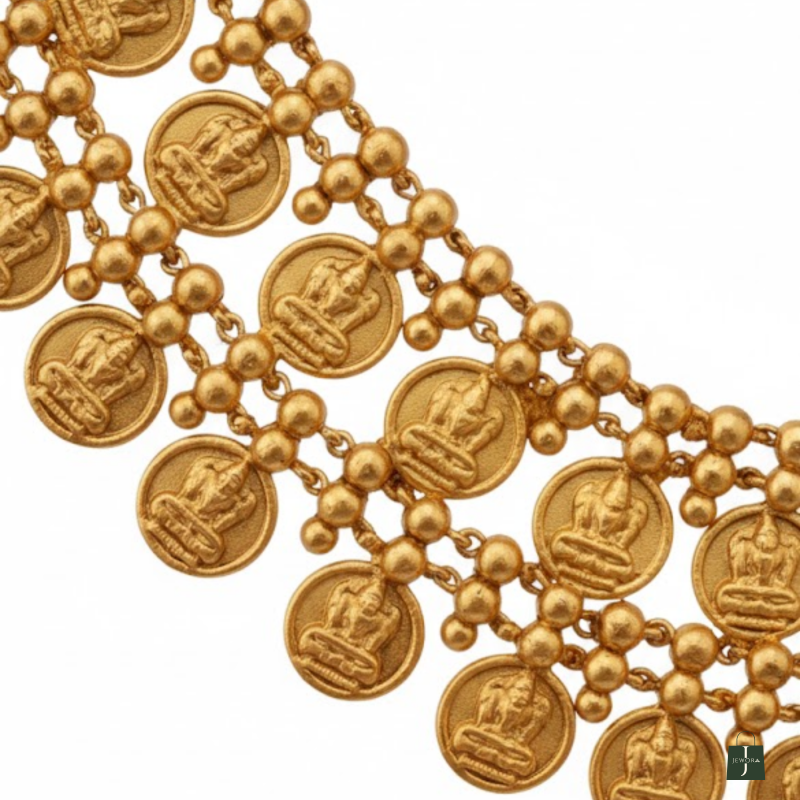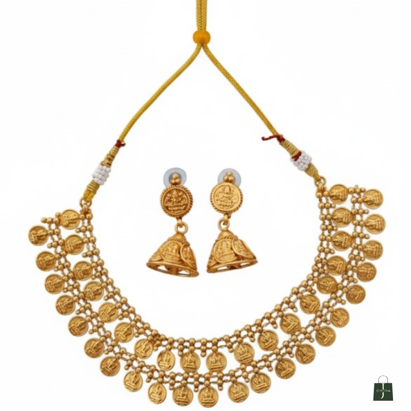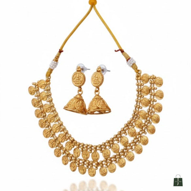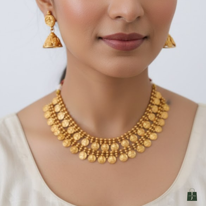 Step into timeless elegance with this Antique Gold Coin Necklace Set, inspired by classic South Indian temple jewellery. The design features rows of embossed coin motifs representing prosperity and heritage, paired beautifully with matching coin-and-jhumka earrings. Crafted with precision and finished in antique gold, this set brings effortless grace to weddings, festive occasions, and ethnic celebrations.