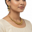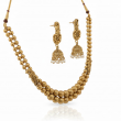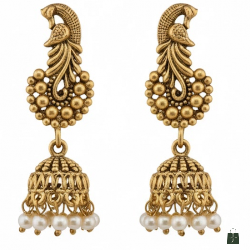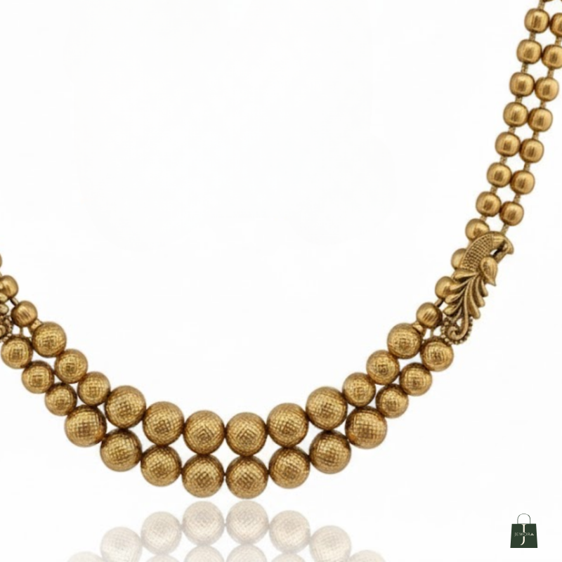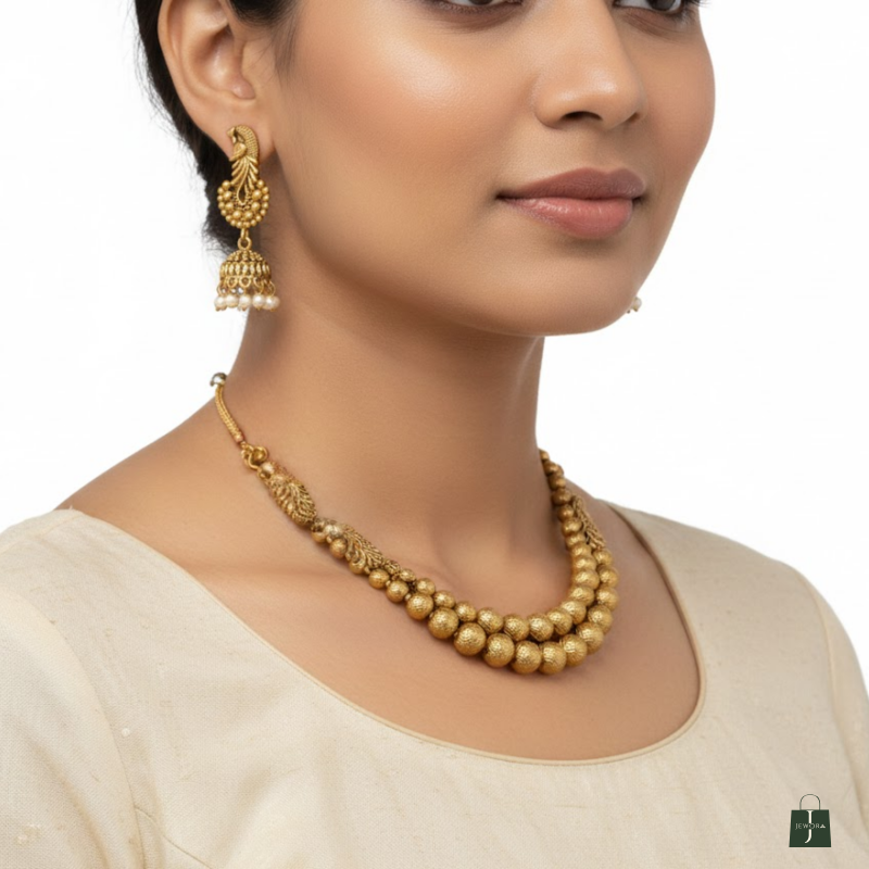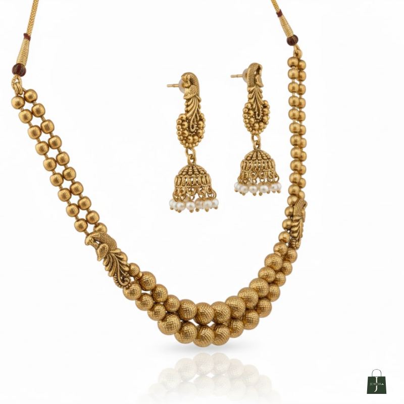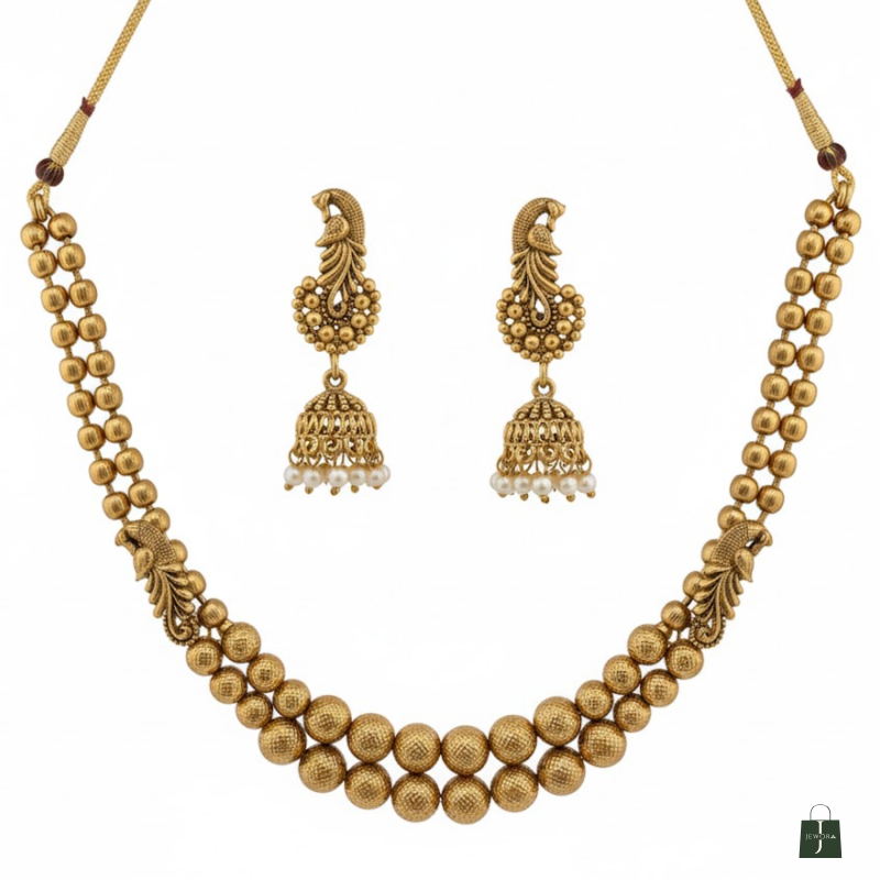 This Antique Gold Beaded Necklace Set brings timeless tradition to modern elegance. Designed with two layers of antique-finished beads, it radiates subtle sophistication and charm. The matching peacock-style jhumka earrings complete the look, making this set perfect for festive occasions, weddings, and cultural gatherings. Lightweight and gracefully designed, itβs a must-have addition to your ethnic jewellery collection.