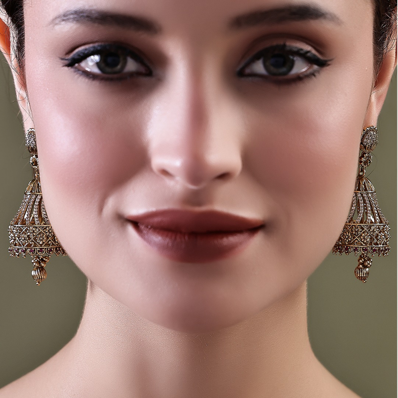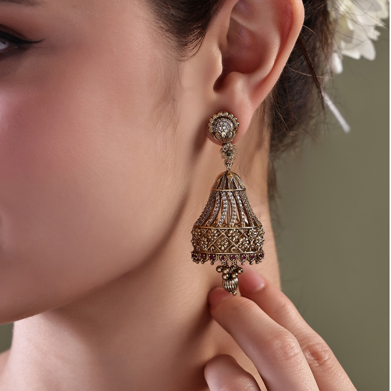 Add a touch of classic charm to your jewelry collection with these beautifully crafted dome-shaped jhumka earrings. Featuring delicate floral motifs and fine lattice work, these earrings showcase traditional artistry with a refined antique gold finish. The subtle shimmer of clear stones enhances the elegance, making them perfect for festive occasions, weddings, or ethnic everyday wear.