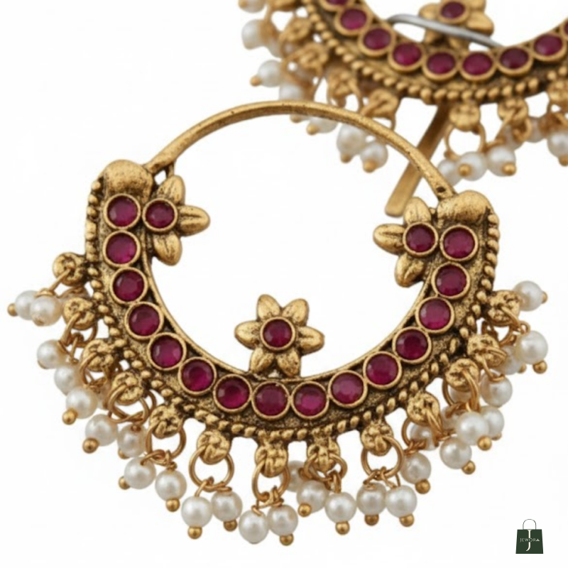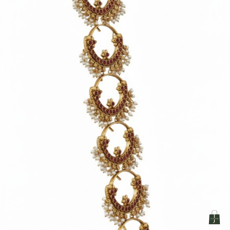 Elevate your hairstyle with this exquisite Antique Gold Hair Pin Set, handcrafted with intricate floral motifs, royal red stones, and delicate pearl drops. Designed to add a touch of tradition and sophistication, these pins are perfect for weddings, festive events, and classical performances. Lightweight and secure, they blend timeless charm with modern elegance — the perfect finishing touch to your traditional look.