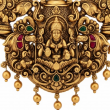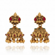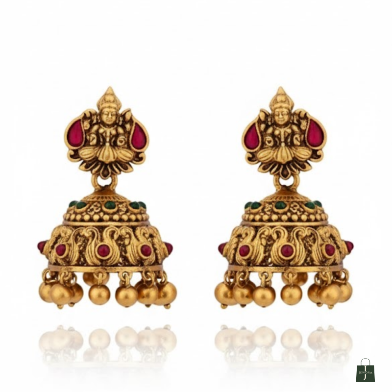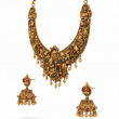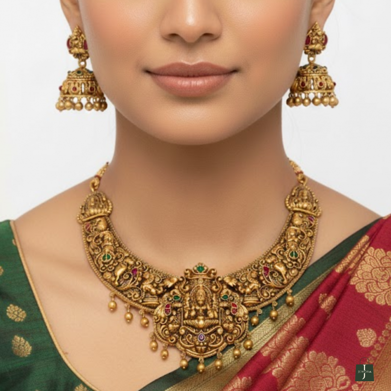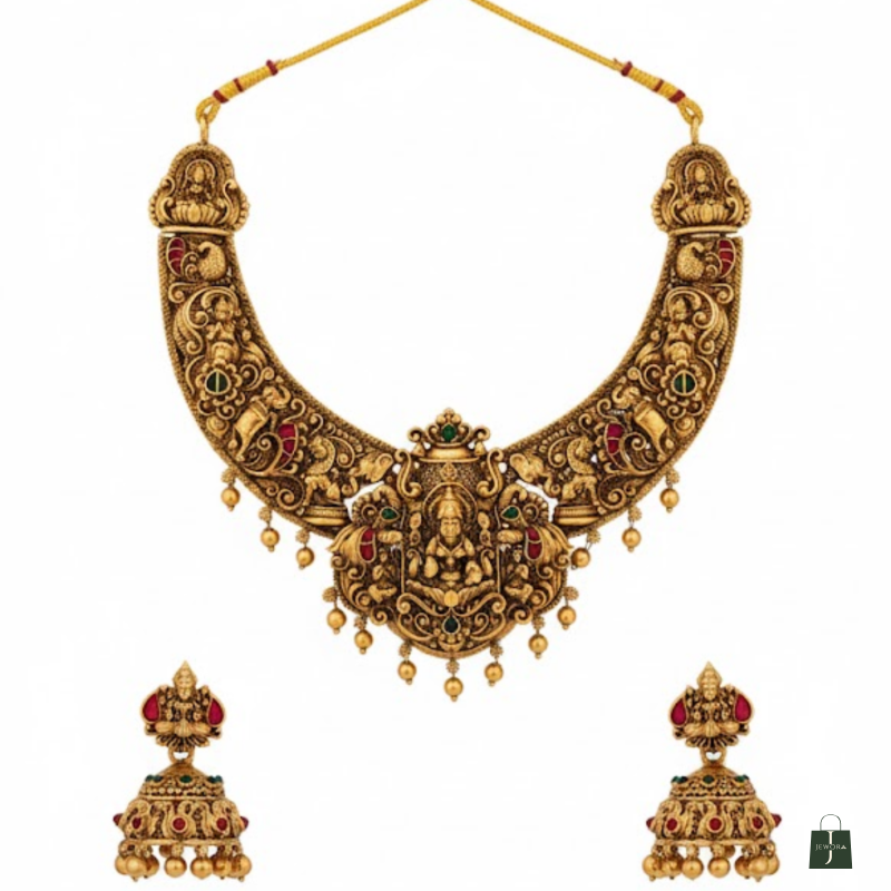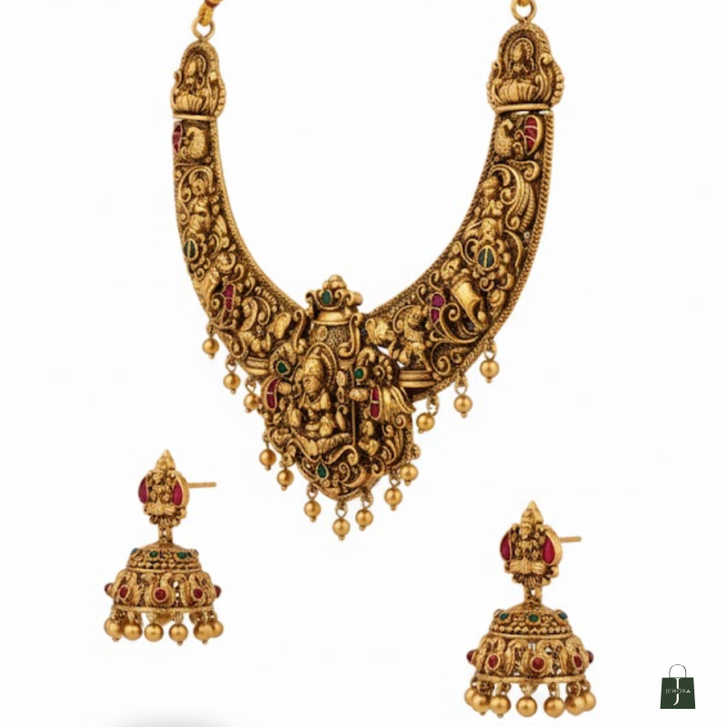 Adorn yourself in divine splendour with this Antique Gold Temple Necklace Set, inspired by South Indian heritage craftsmanship. The centerpiece features an exquisite Goddess Lakshmi motif, surrounded by intricate carvings, ruby accents, and tiny golden beads. The antique finish enhances its royal appeal, while the matching jhumka earrings complete the look. Perfect for weddings, festive occasions, and cultural celebrations — this statement piece embodies timeless elegance and sacred beauty.