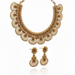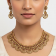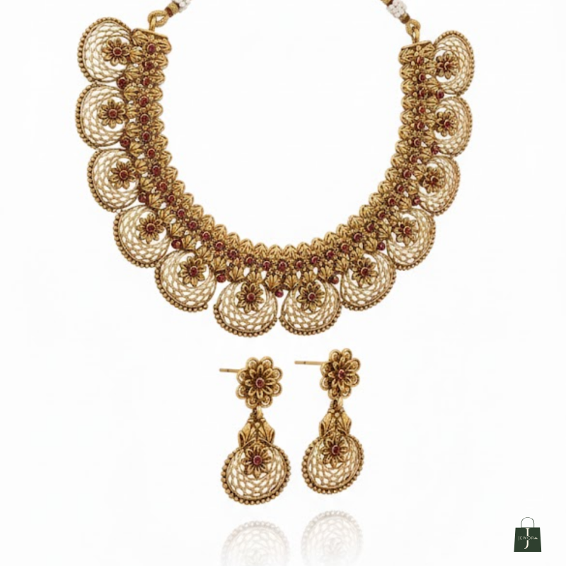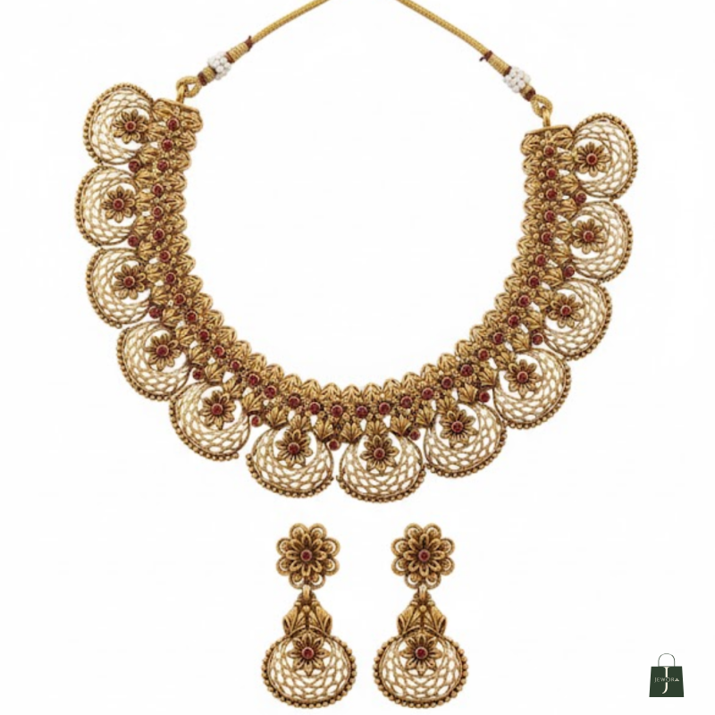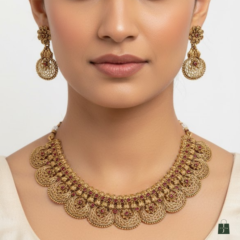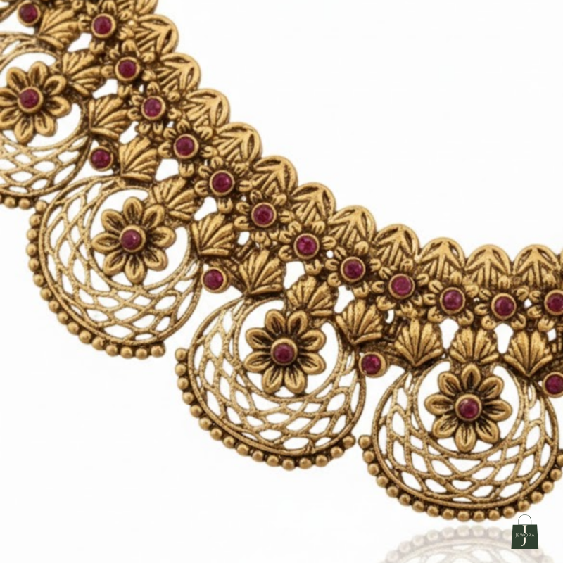 This Antique Gold Choker Necklace Set is a masterpiece of traditional elegance and fine craftsmanship. Designed with intricate filigree patterns and layered motifs, the necklace exudes regal charm. The delicate jhumka-style earrings add a graceful finishing touch. Perfect for weddings, festive occasions, or cultural events, this statement piece enhances any ethnic ensemble with a timeless, royal allure.