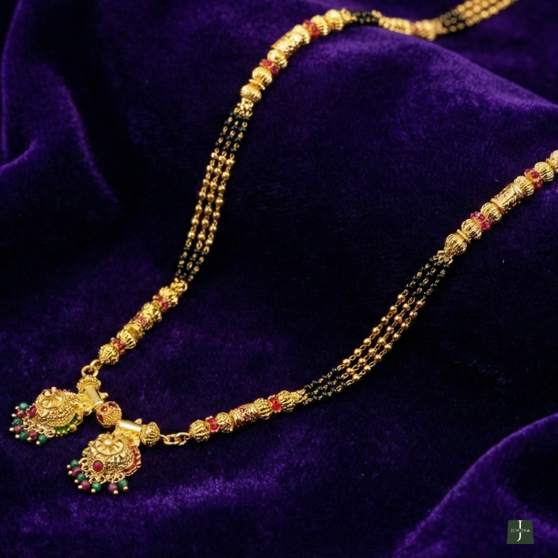 Celebrate the sacred bond of marriage with this exquisitely crafted Heritage Radiance Mangalsutra. This masterpiece features a majestic, circular gold pendant adorned with intricate filigree and concentric patterns, echoing timeless temple jewelry aesthetics. Delicate ruby-red accents and vibrant emerald-colored droplets add a touch of royal grandeur.
