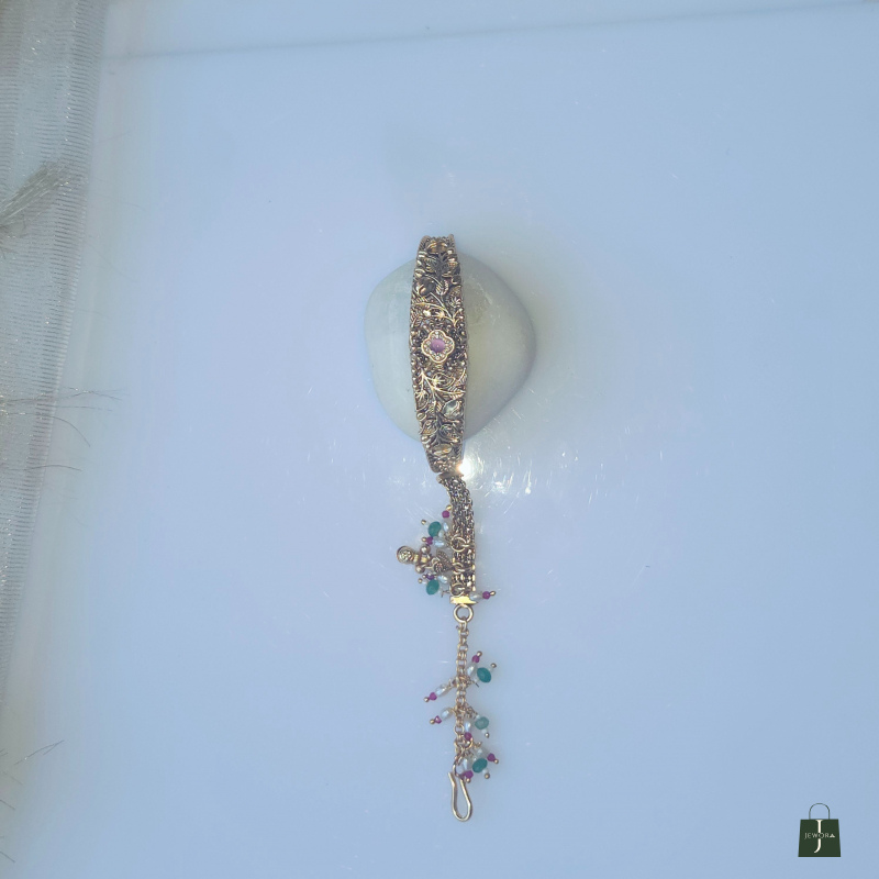 Enhance your ethnic elegance with this antique gold-plated filigree bracelet for women, designed to reflect timeless Indian artistry. The bracelet showcases intricate floral patterns with fine detailing, highlighted by a beautiful pink stone centerpiece that adds a royal touch.