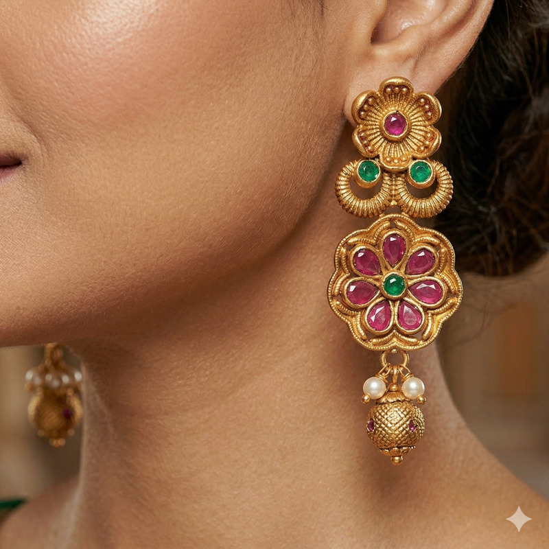 Embrace the timeless beauty of South Indian heritage with these stunning Antique Gold-Plated Drop Earrings. A perfect blend of tradition and craftsmanship, these earrings are a must-have for every ethnic jewelry collection.