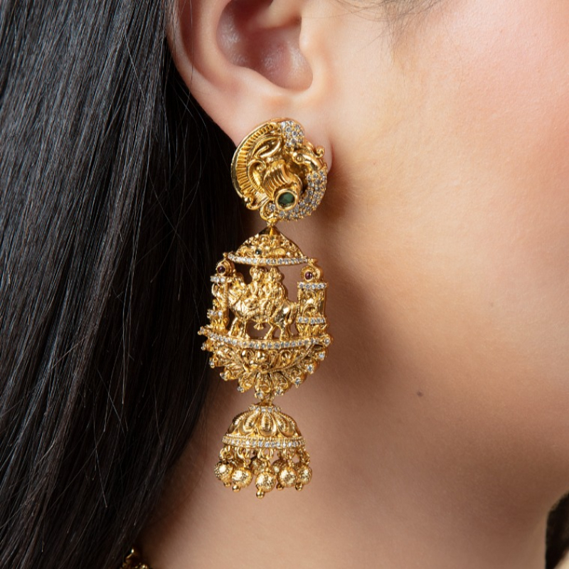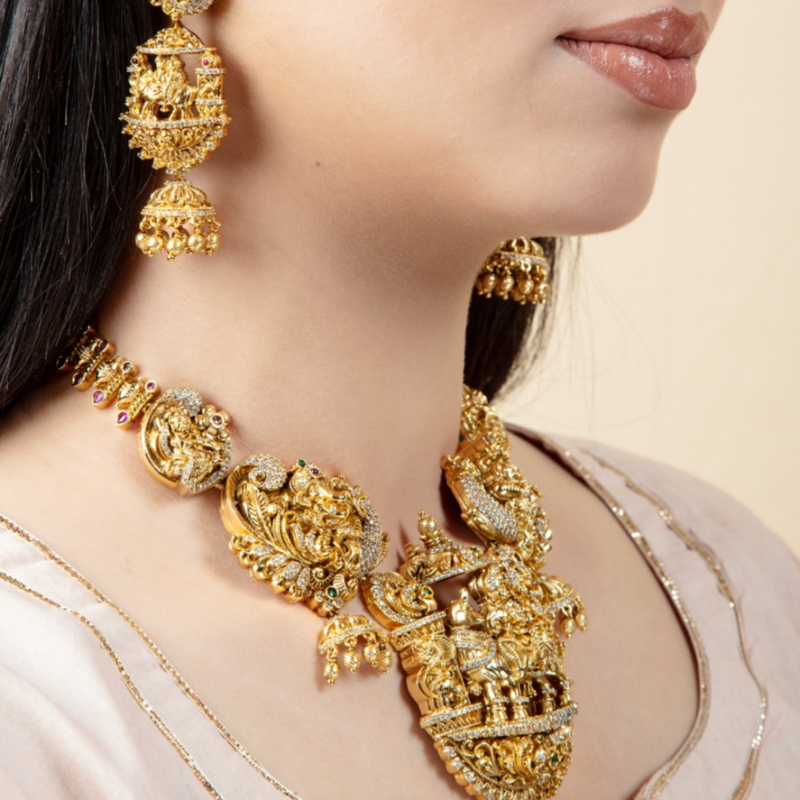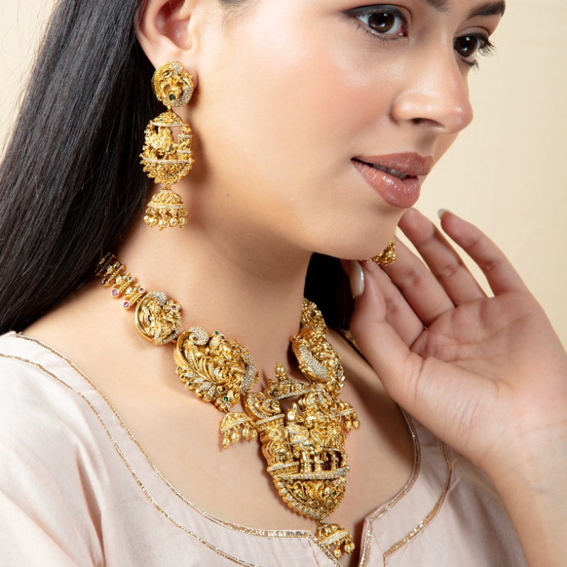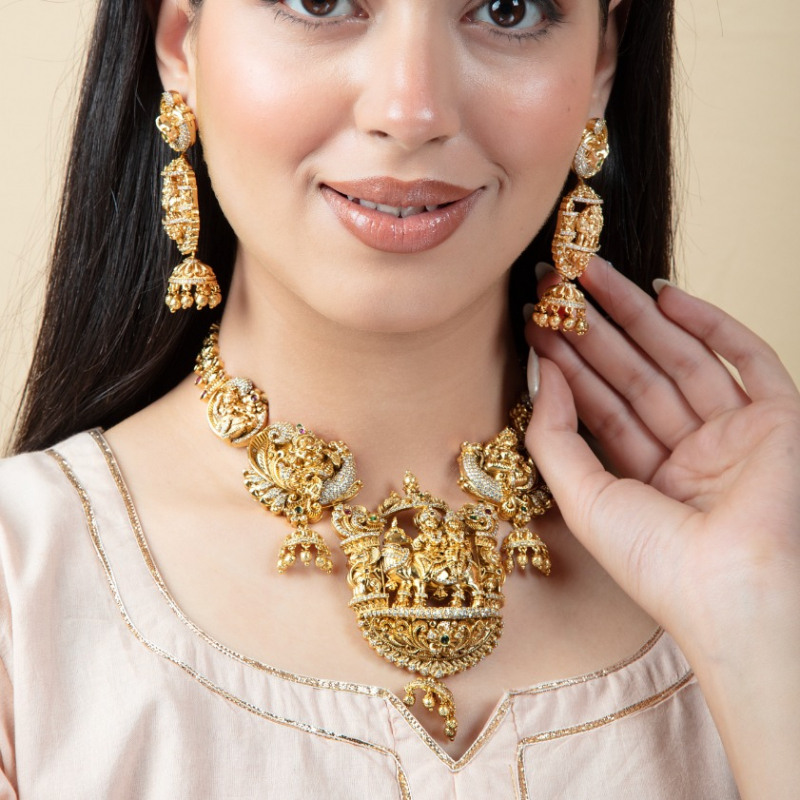 Make a majestic statement with this opulent temple-style necklace set, featuring a beautifully sculpted Goddess Lakshmi pendant at its center. Surrounded by intricate carvings of traditional motifs like elephants and peacocks, this piece reflects rich South Indian heritage craftsmanship. The detailed gold work, combined with subtle stone embellishments and delicate jhumka danglers, creates a regal and divine aura. Perfect for bridal wear, weddings, and grand festive occasions, this set is designed to stand out and elevate any ethnic ensemble.