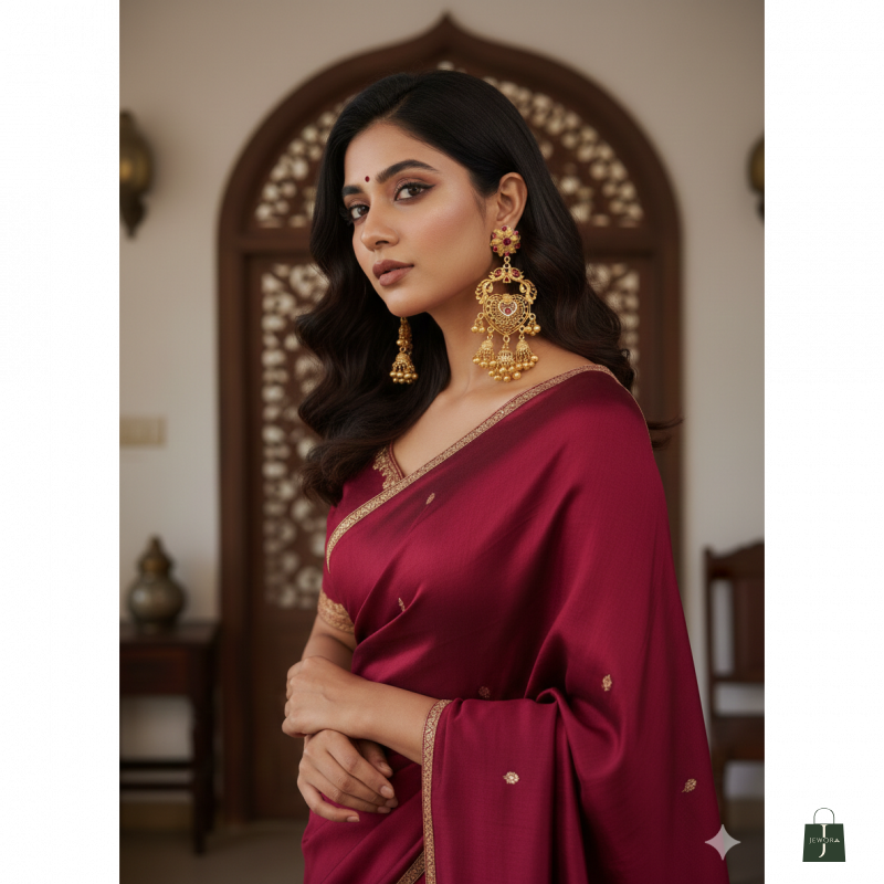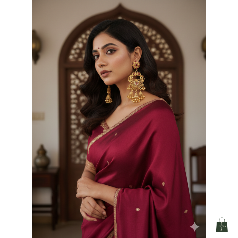 Versatility: Shown here paired with a rich Burgundy Silk Saree, these earrings are ideal for weddings, festivals (like Diwali or Karwa Chauth), and high-end formal events.