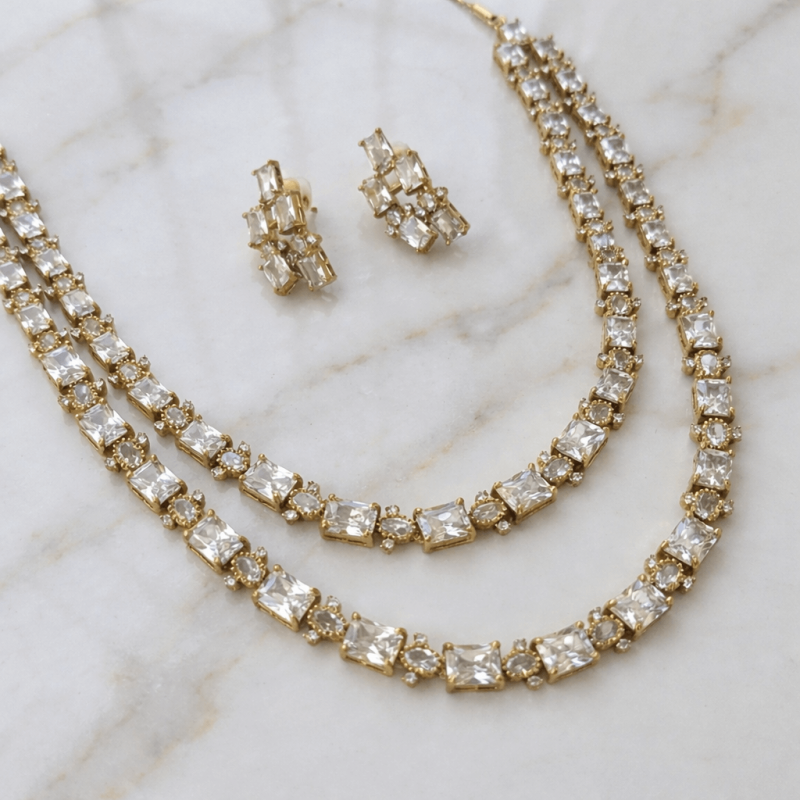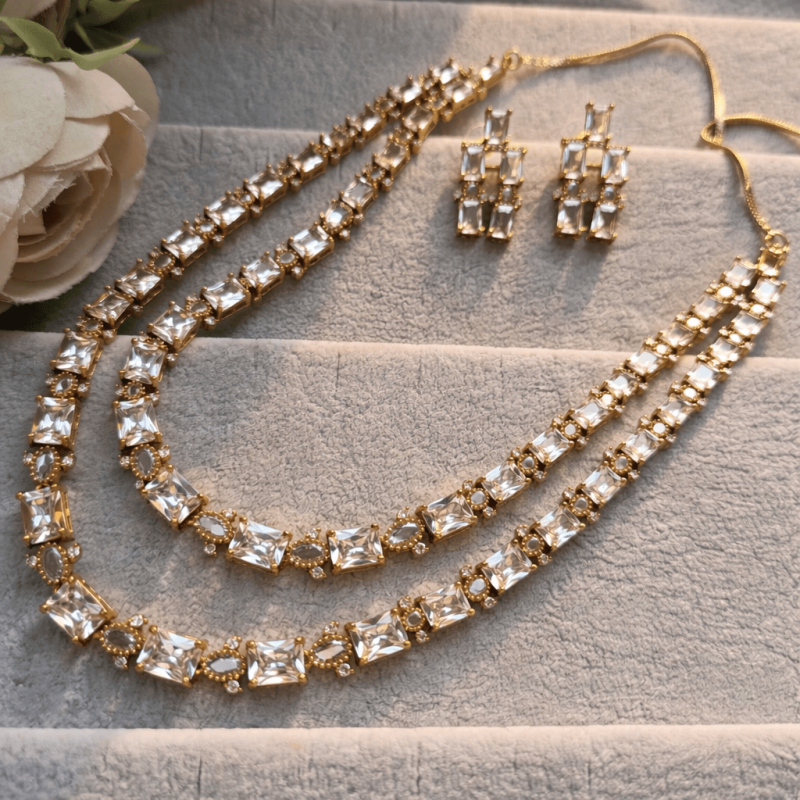 Add timeless elegance to your jewelry collection with this beautiful antique gold polish AD stone necklace set. Designed with a graceful double-layer pattern, the necklace features sparkling American Diamond (AD) stones arranged in a combination of rectangular and oval shapes, creating a rich and sophisticated look.