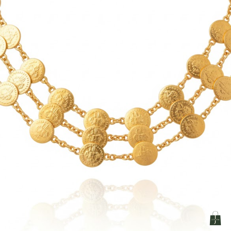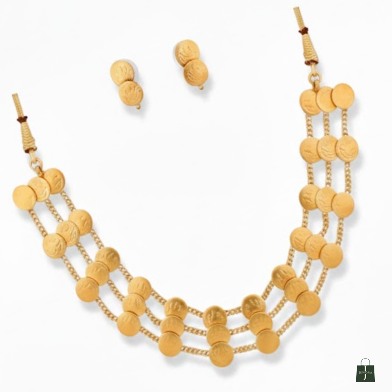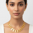 Simple yet regal, this Antique Gold Square Coin Choker Set reflects the timeless artistry of traditional jewellery. Designed with square coin motifs and a rich matte gold finish, this piece brings understated sophistication to any festive or ethnic look. The matching stud earrings complete the ensemble, making it perfect for weddings, parties, and cultural celebrations.