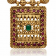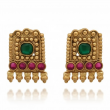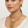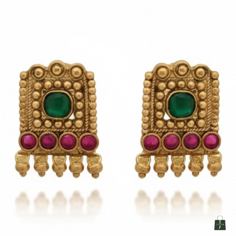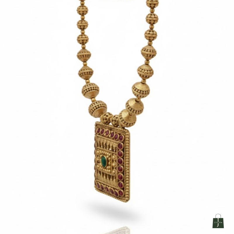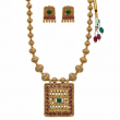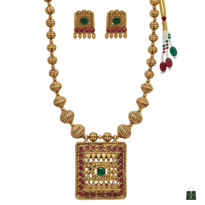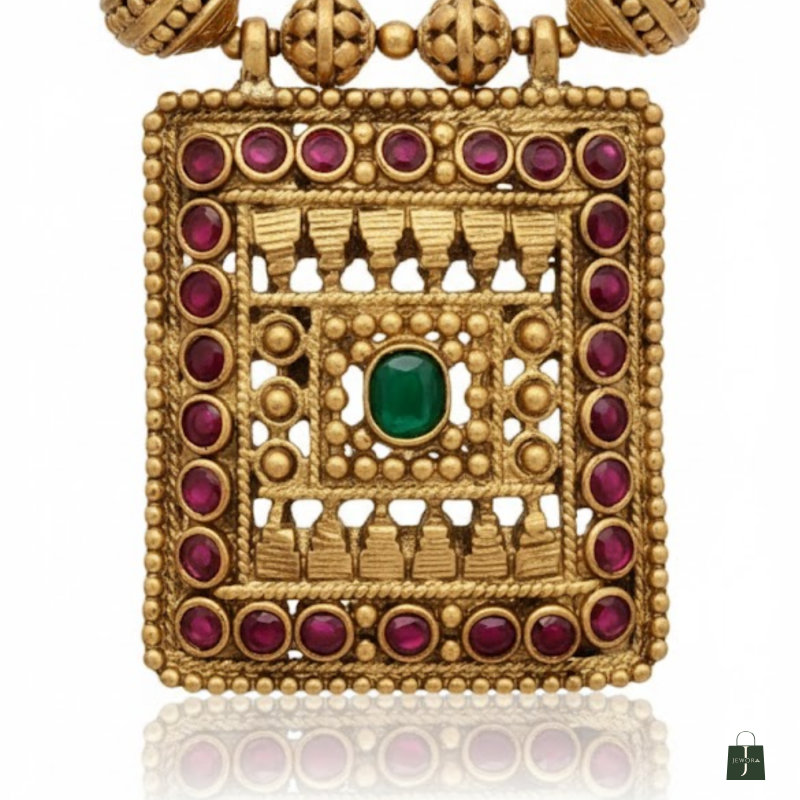 Channel the essence of divine tradition with this Antique Gold Square Temple Necklace Set, inspired by South Indian heritage designs. The beautifully carved square pendant features intricate temple detailing with ruby and green stones, symbolising strength and prosperity. The matching earrings mirror the same ornate craftsmanship, making this set ideal for weddings, festive occasions, and cultural events.