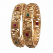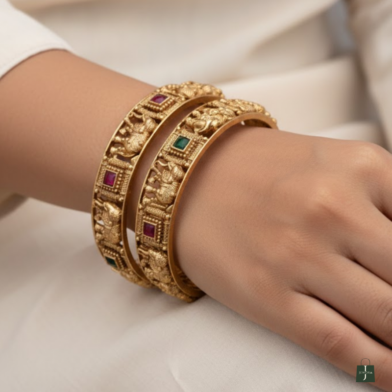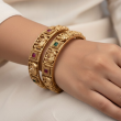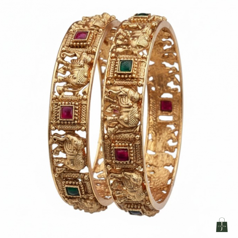 Embodying the grandeur of South Indian artistry, this Temple Elephant Design Bangle Set captures the essence of traditional elegance. Intricately handcrafted with divine elephant motifs and detailed carvings, these bangles are adorned with vibrant ruby and emerald-coloured stones. Perfectly blending heritage with luxury, they are ideal for weddings, festive occasions, and traditional celebrations.