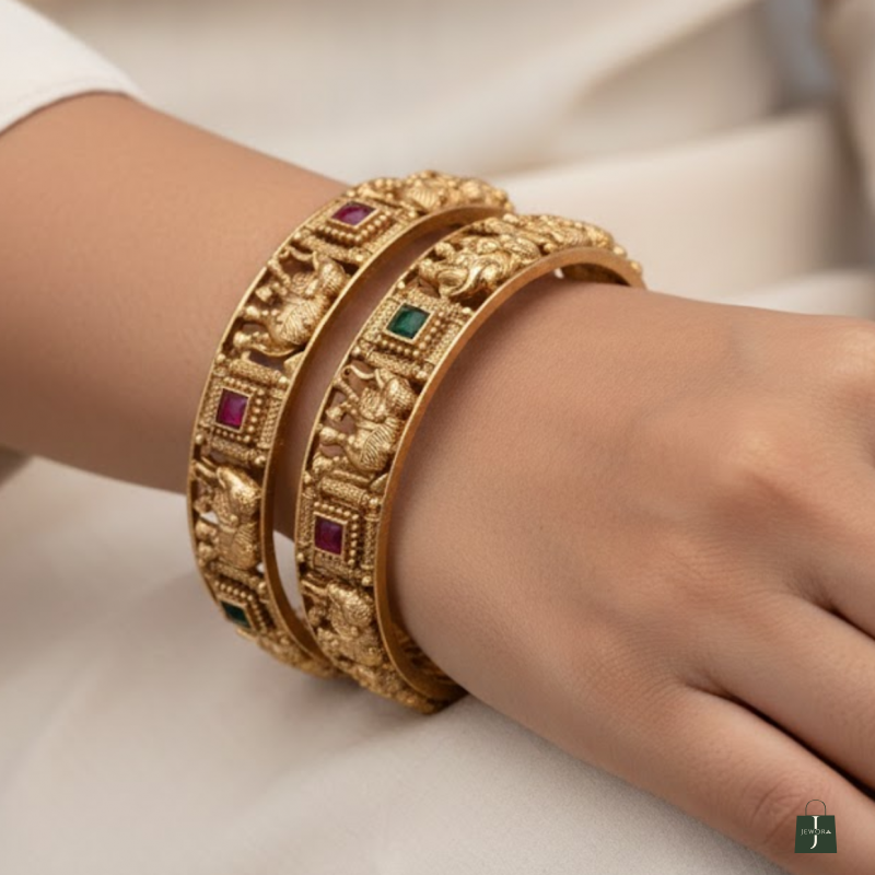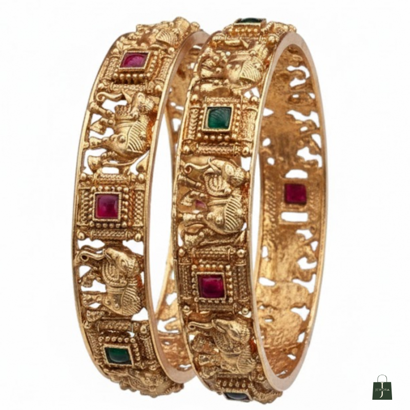 Embodying the grandeur of South Indian artistry, this Temple Elephant Design Bangle Set captures the essence of traditional elegance. Intricately handcrafted with divine elephant motifs and detailed carvings, these bangles are adorned with vibrant ruby and emerald-coloured stones. Perfectly blending heritage with luxury, they are ideal for weddings, festive occasions, and traditional celebrations.