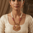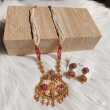 Add a touch of elegance to your ethnic look with this beautifully designed antique gold tone statement necklace set featuring multi-layer pearl bead strands and vibrant pink hydro beads. The necklace showcases an intricately crafted pendant with delicate floral detailing and traditional motifs, giving it a rich and graceful appeal.