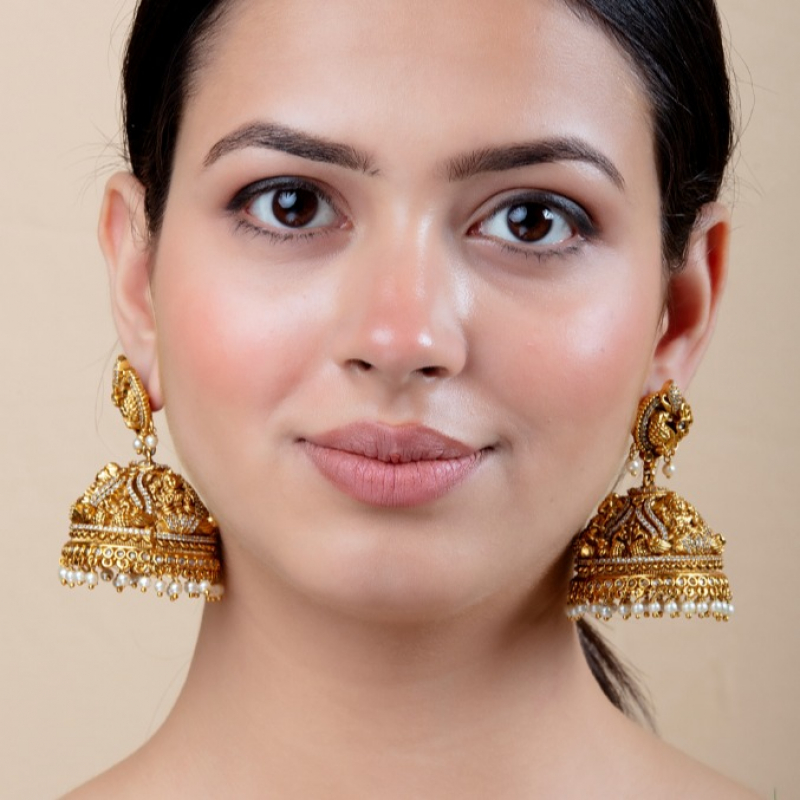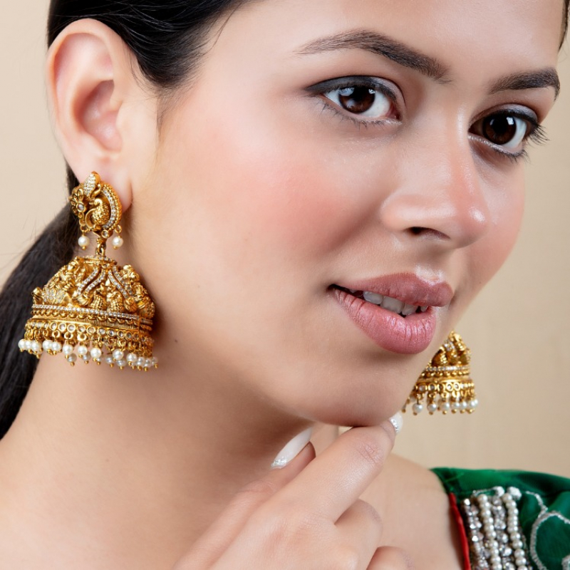 Celebrate traditional elegance with these beautifully crafted temple jhumka earrings featuring a divine Goddess Lakshmi motif. Designed with intricate carvings and rich antique gold polish, the earrings showcase a detailed floral stud top leading to a grand dome-shaped jhumka adorned with fine beadwork and pearl hangings. The heritage-inspired craftsmanship and religious motif make it a perfect choice for weddings, festive occasions, and cultural celebrations.
