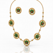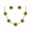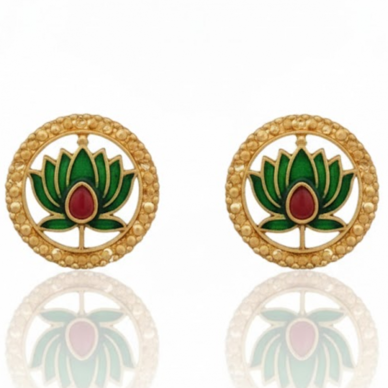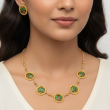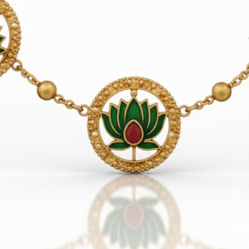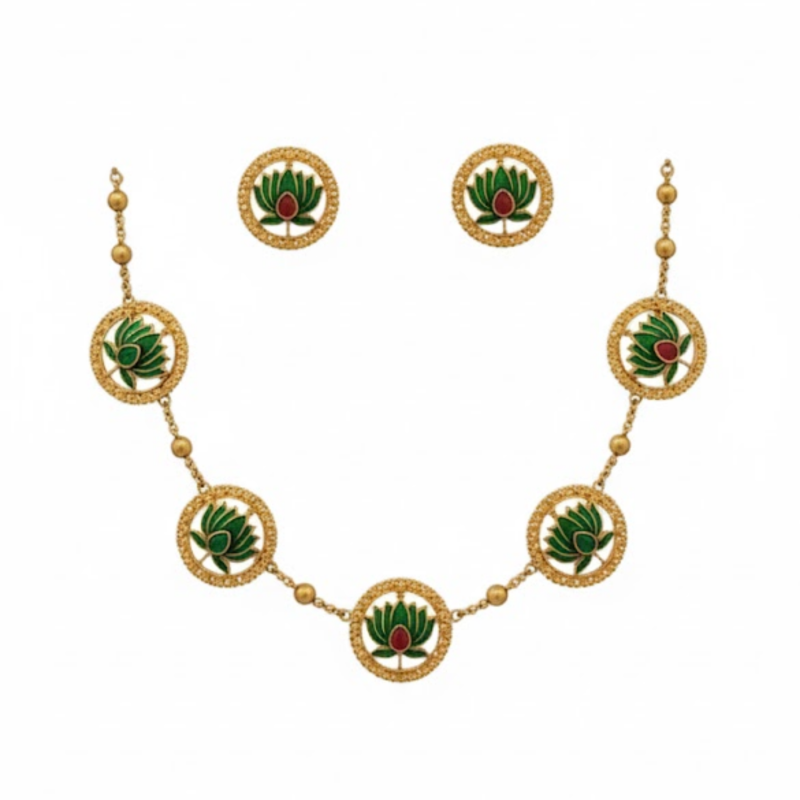 A symbol of grace and purity, this handcrafted Lotus Design Necklace Set brings together traditional elegance and artistic craftsmanship. Each lotus motif is beautifully detailed with green enamel petals surrounded by an antique gold border, exuding timeless charm. The adjustable golden dori enhances comfort while the matching earrings complete the look — perfect for festive occasions, weddings, or ethnic celebrations.