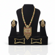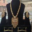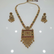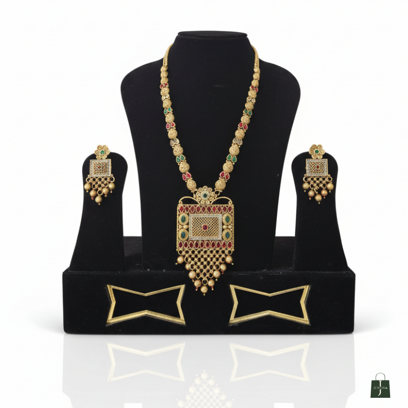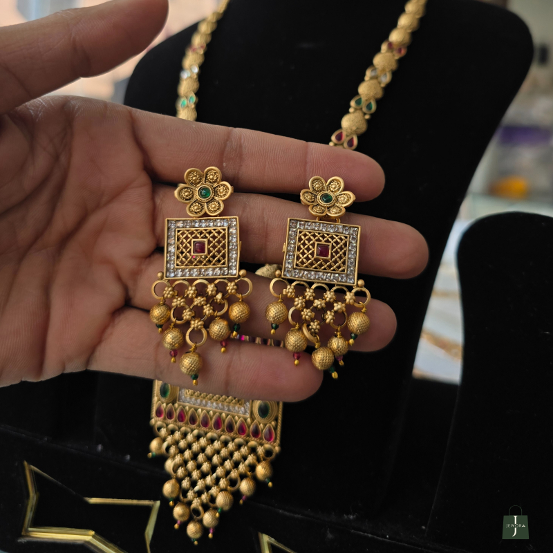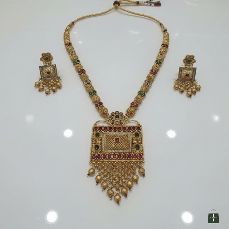 Premium gold‑plated temple jewellery set with long necklace and matching earrings, crafted with multicolour kundan‑style stones and dangling beads for an elegant bridal finish.
