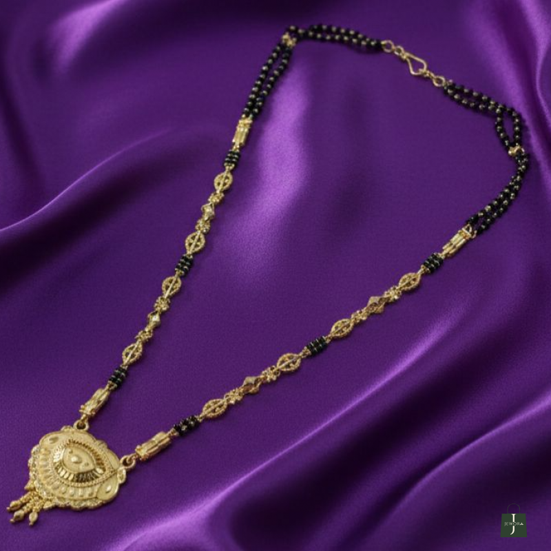 This Royal Medallion Mangalsutra is a masterpiece of traditional craftsmanship, featuring a bold, shield-style pendant with intricate sunburst textures and delicate golden tassels. The unique chain showcases ornate oval gold links interspersed with sacred black beads, offering a regal aesthetic. Blending heritage artistry with modern sophistication, this statement piece is designed to elevate your grace on every special occasion.