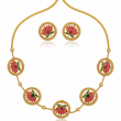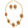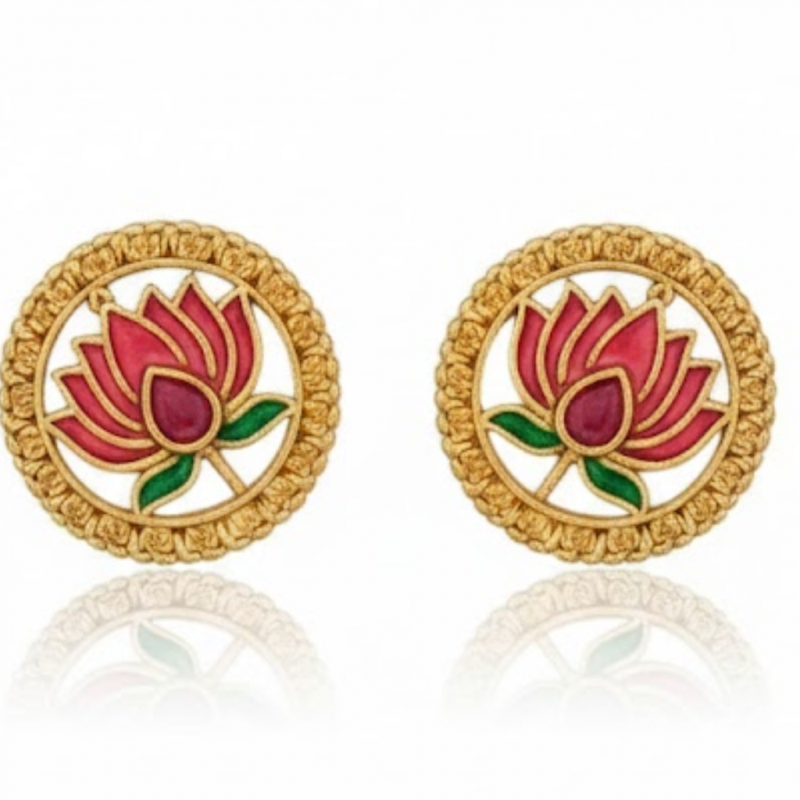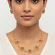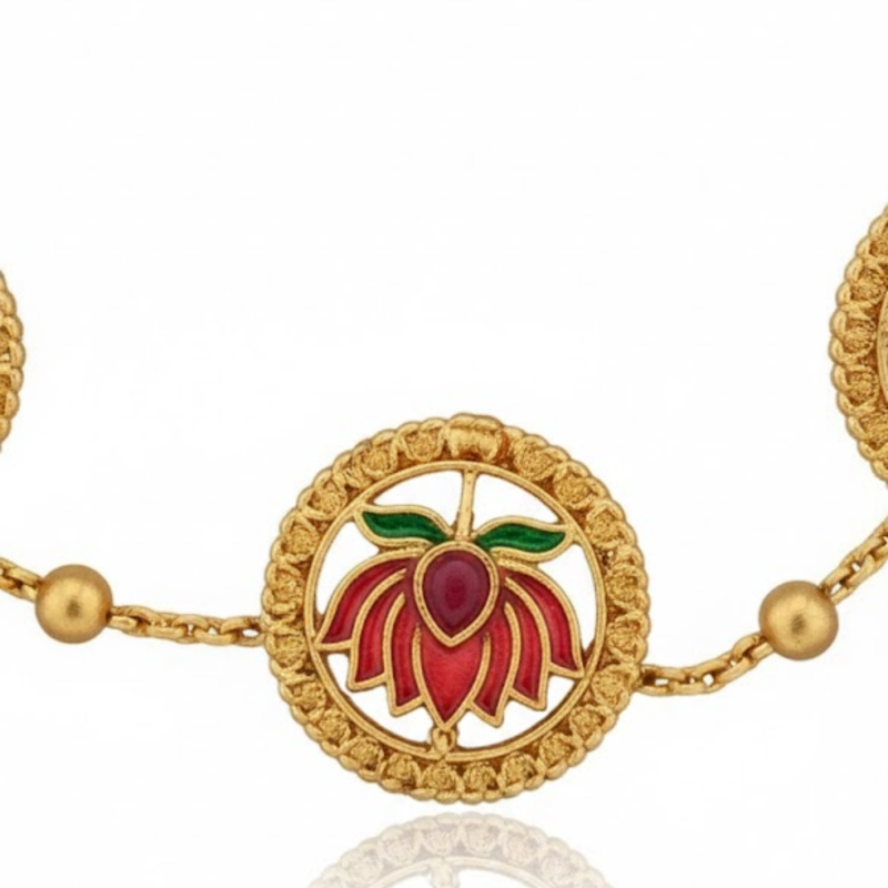A symbol of grace and purity, this handcrafted Lotus Design Necklace Set brings together traditional elegance and artistic craftsmanship. Each lotus motif is beautifully detailed with pink and green enamel petals surrounded by an antique gold border, exuding timeless charm. The adjustable golden dori enhances comfort while the matching earrings complete the look — perfect for festive occasions, weddings, or ethnic celebrations.
