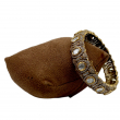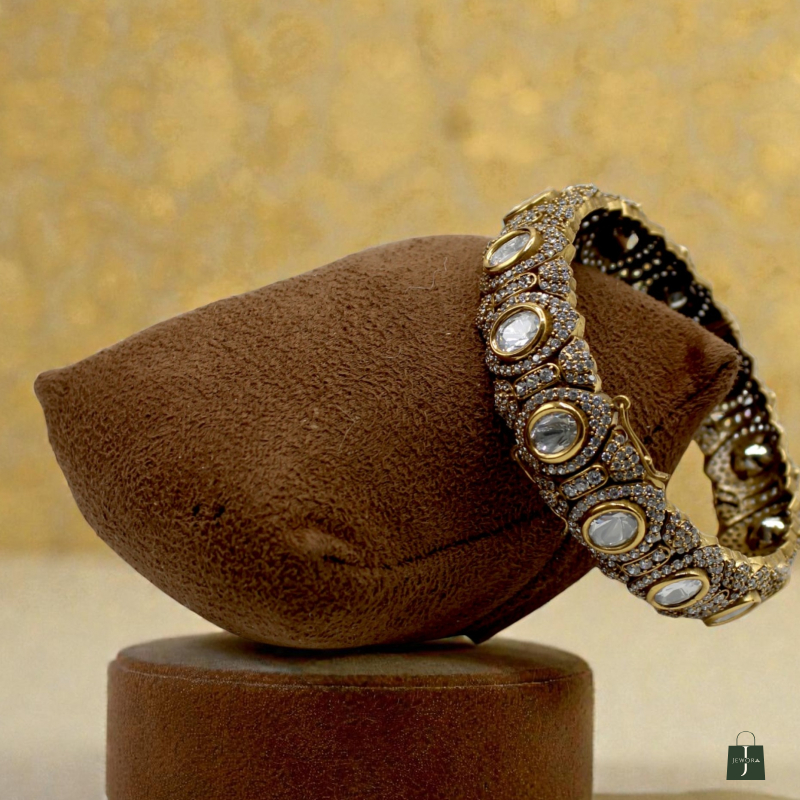 Elevate your traditional look with this exquisite Antique Polki Crystal Statement Kada. Designed with evenly spaced oval-shaped Polki stones, this bracelet showcases fine craftsmanship with intricate micro CZ stone embellishments throughout the band.