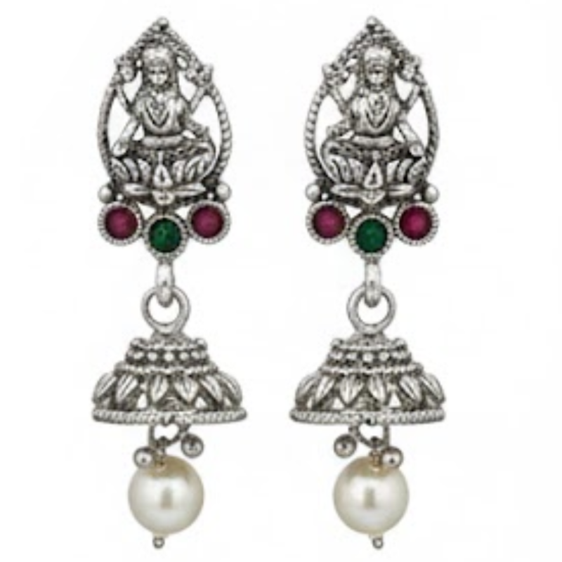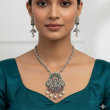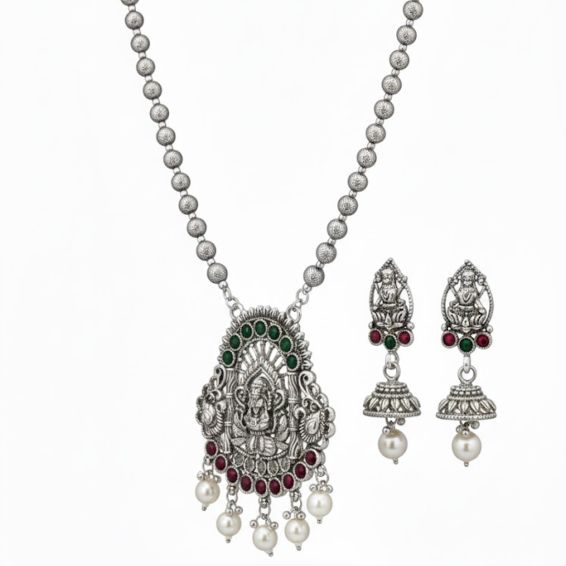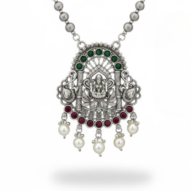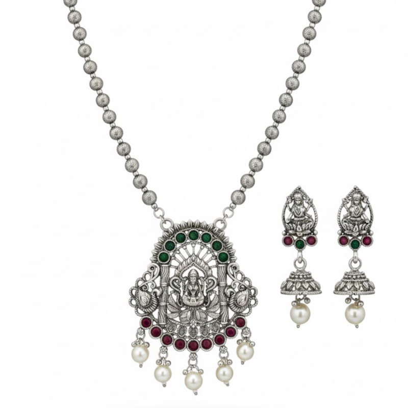 This elegant Antique Silver Temple Necklace Set showcases exquisite craftsmanship inspired by South Indian heritage. The stunning central pendant features Goddess Lakshmi, symbolising prosperity and divine grace, surrounded by intricate carvings and adorned with delicate pearl drops. Paired with matching earrings, this set blends tradition and sophistication — perfect for festive wear, weddings, and cultural occasions.