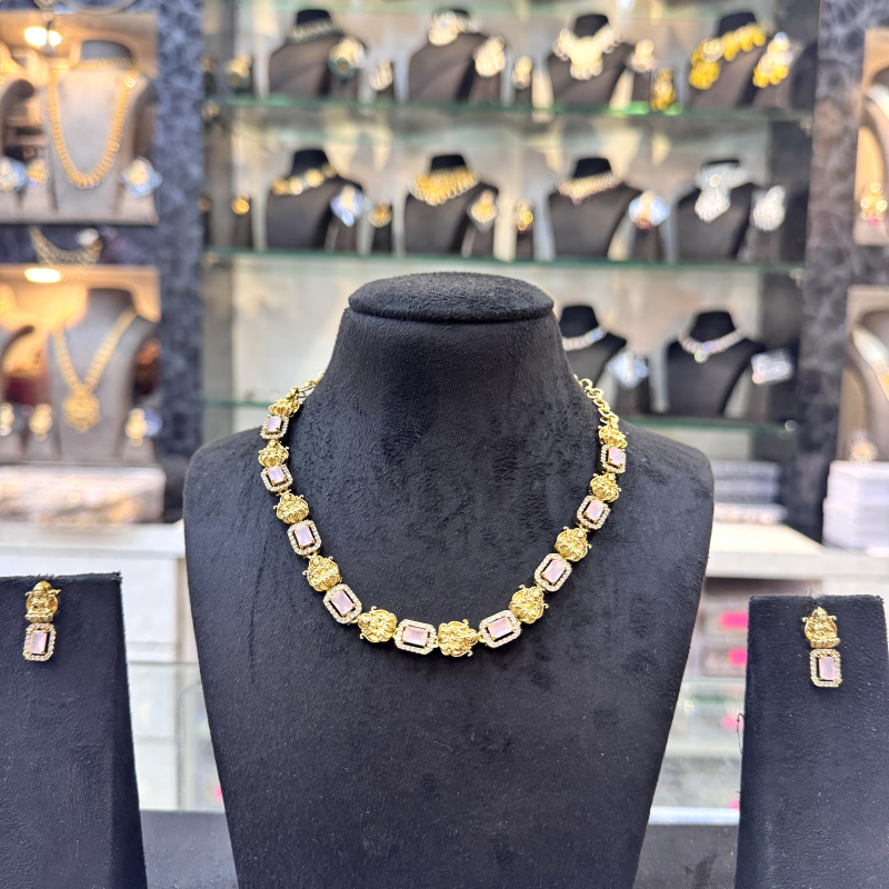 This masterpiece from Jewora is ideal for women who appreciate timeless temple jewelry. With its striking combination of antique gold motifs and vibrant stones, it enhances bridal ensembles, festive looks, and cultural celebrations. Handcrafted with precision, this necklace set adds an aura of tradition and luxury to every occasion.