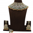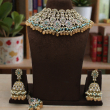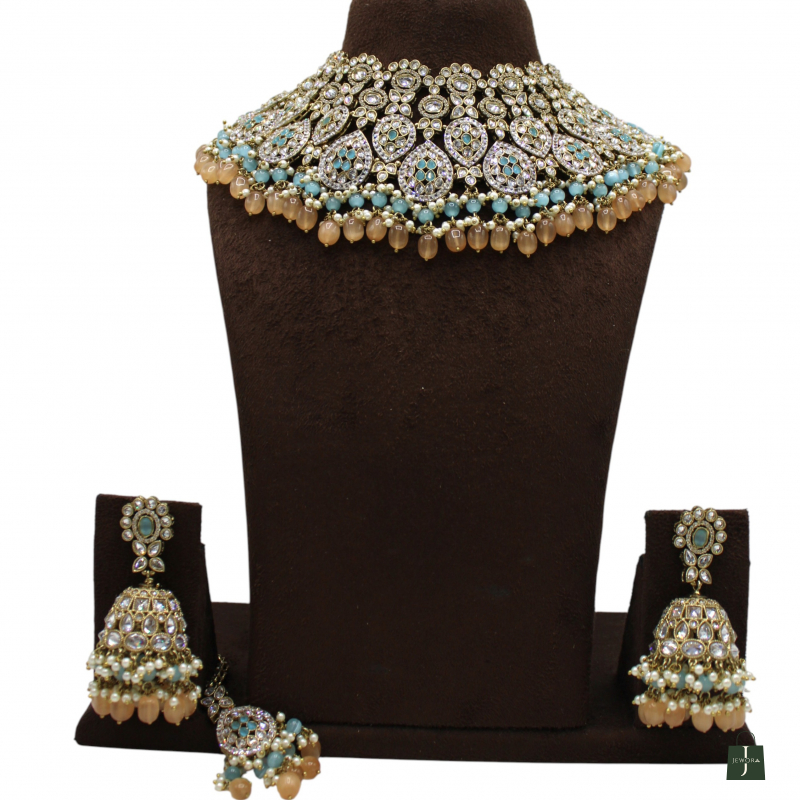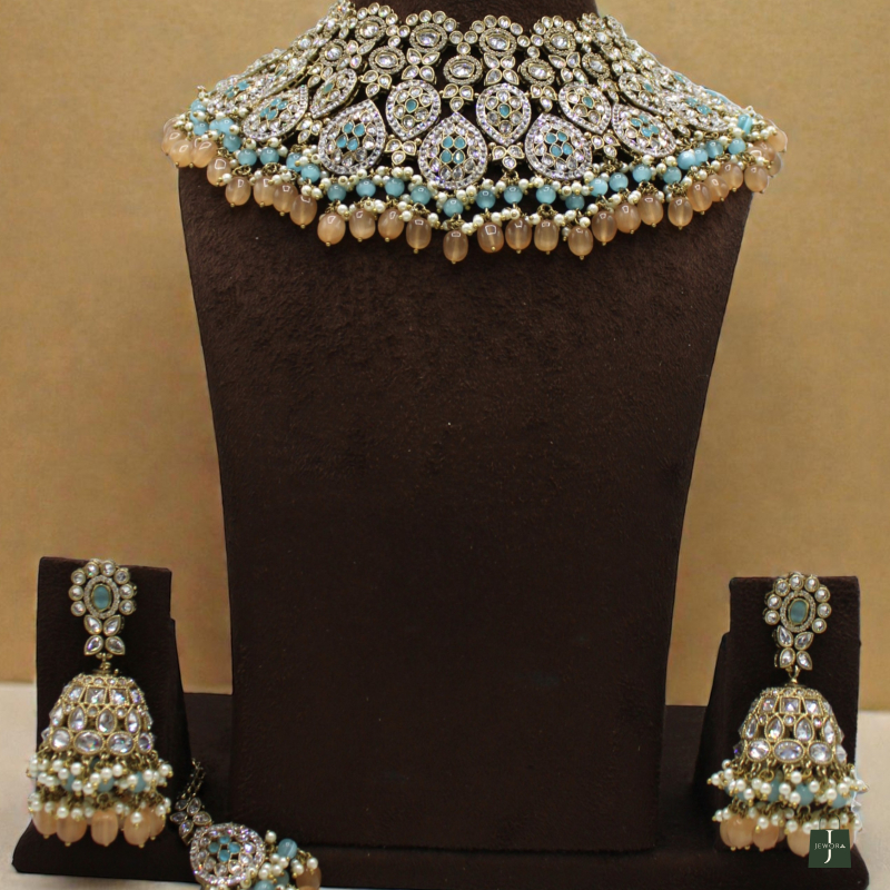 Elevate your traditional look with this Aqua Pearl Heritage Kundan Choker Set, crafted for brides who love soft pastel elegance with royal detailing. The choker features intricate kundan-style white stones arranged in a layered teardrop pattern, highlighted with refreshing aqua blue accents.