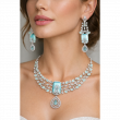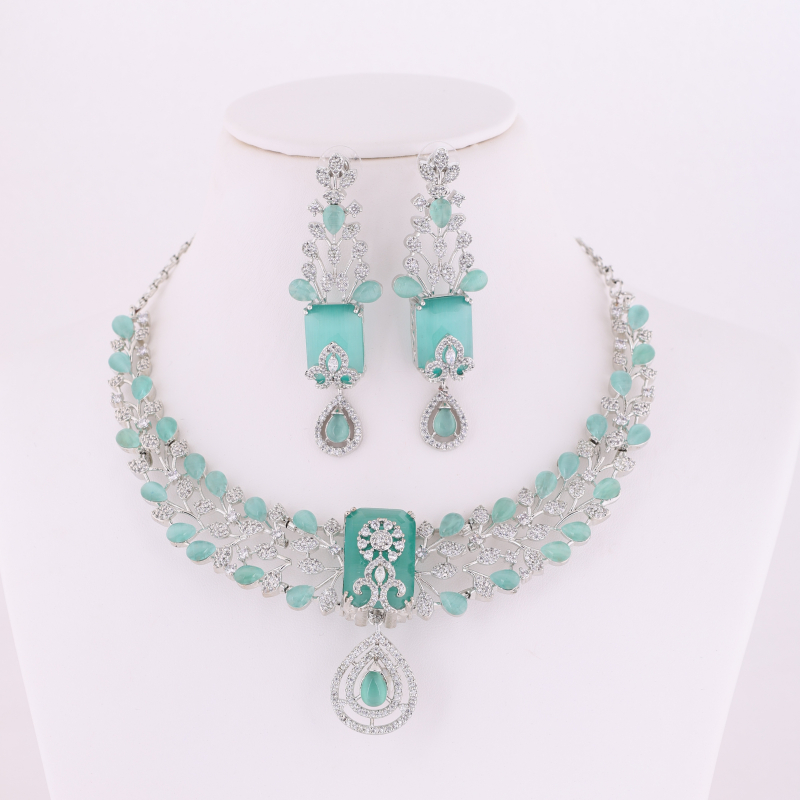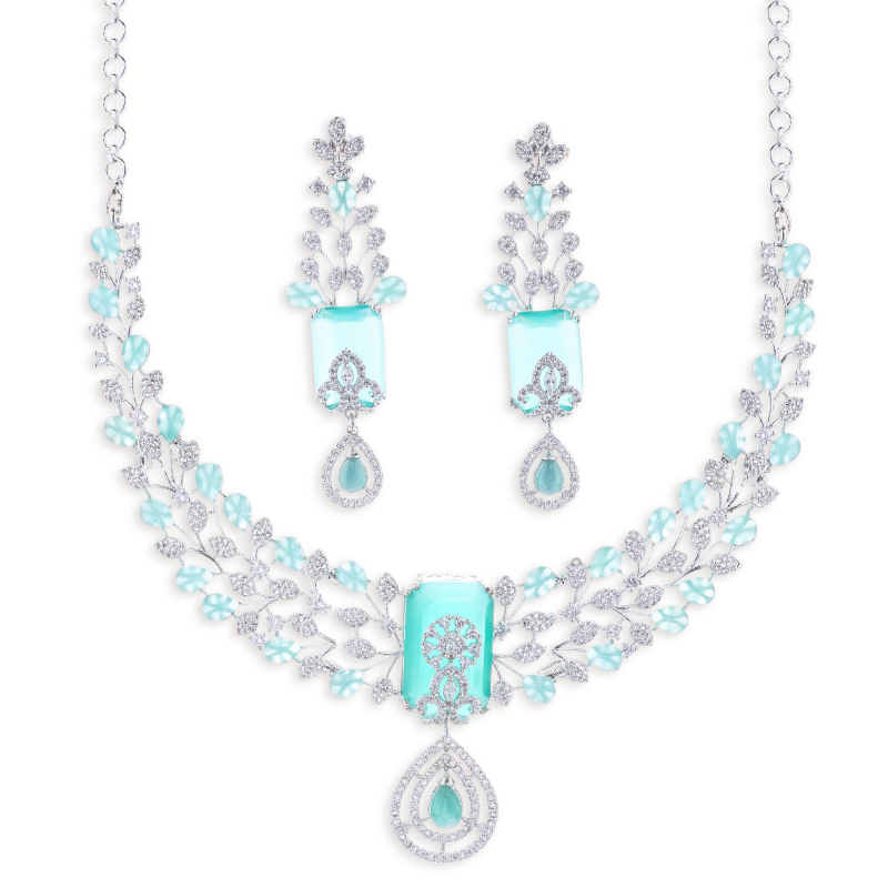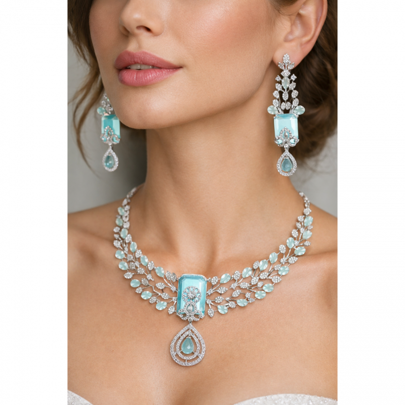 This American diamond rhodium plated multi layer luxurious shine necklace set made with exquisite craftsmanship paired with matching earrings, This design adds a touch of elegance to any outfit