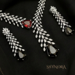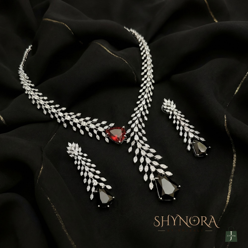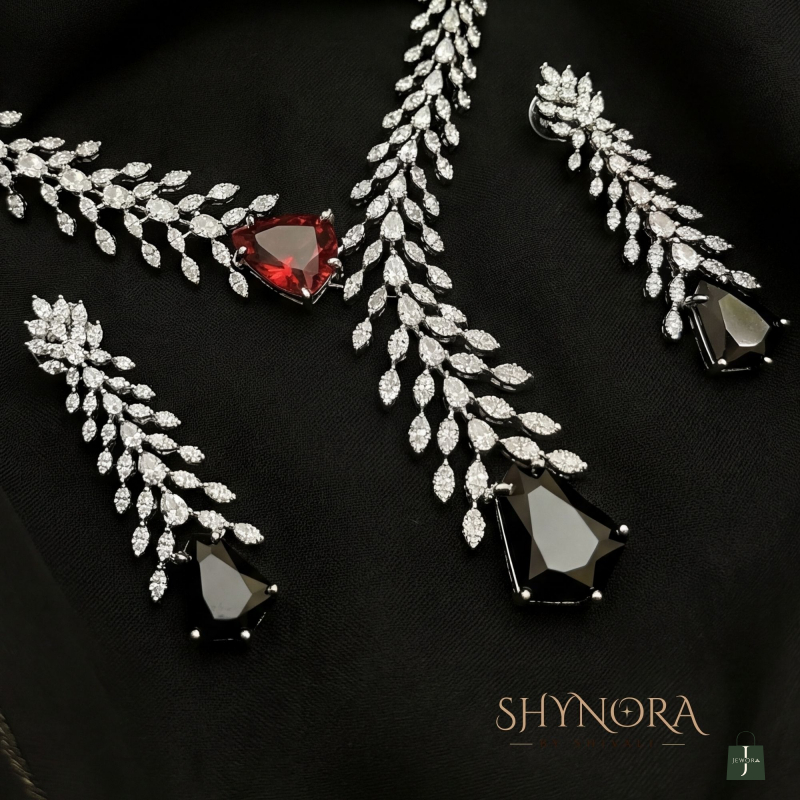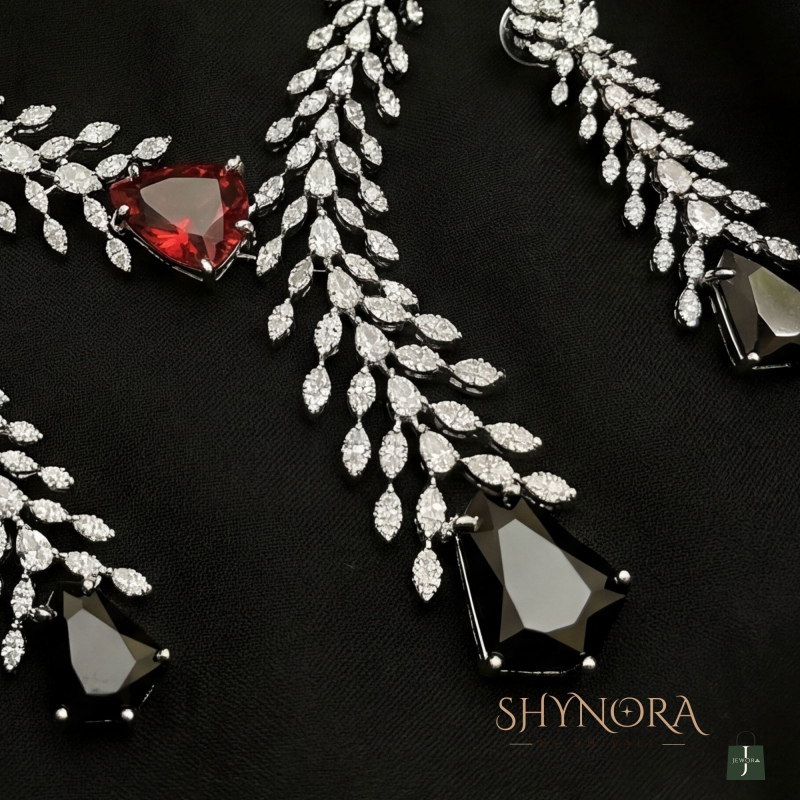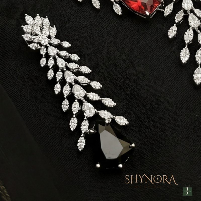 The Arvena Dual-Tone Leaf Drop Necklace Set is a striking blend of modern elegance and artistic design. Crafted with delicate leaf-shaped crystal motifs, the necklace flows into a unique asymmetrical drop highlighted by a bold ruby-red stone on one side and a dramatic midnight-black stone at the centre. The cascading leaf pattern adds graceful movement, making this set effortlessly sophisticated.