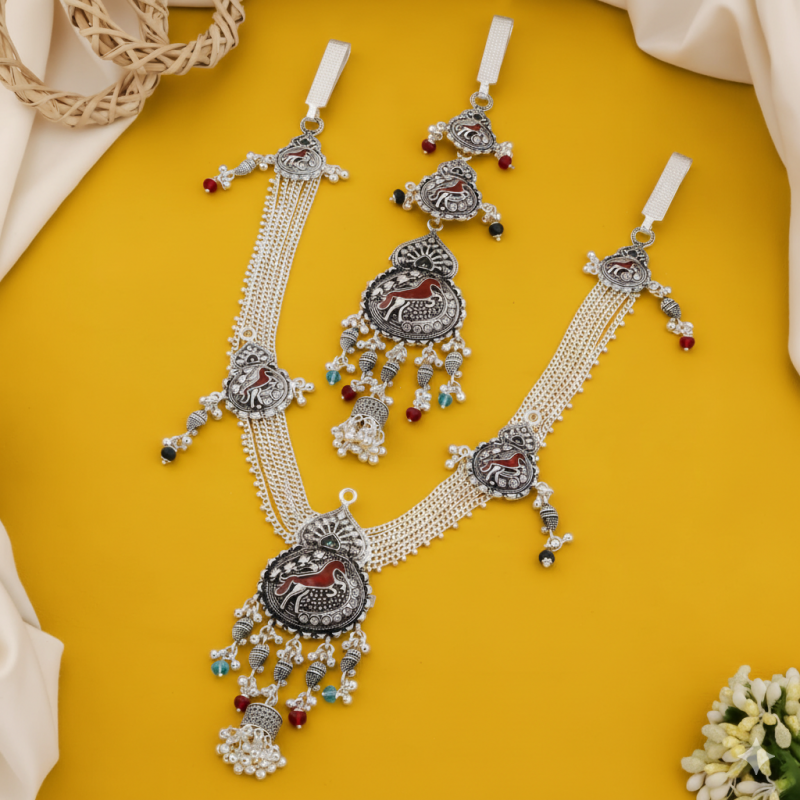 This unique oxidised kamarbandh features intricately designed horse medallion motifs, symbolizing power, grace, and royal heritage. The detailed centerpiece showcases a beautifully engraved horse surrounded by traditional patterns that enhance its ethnic charm. Multiple delicate chain strands drape across the waist, forming elegant layered cascades that add richness to the design. Decorative tassels with pearl-like beads and multicolor drops create graceful movement, making this kamarbandh a striking accessory for sarees, lehengas, and festive ethnic attire.