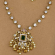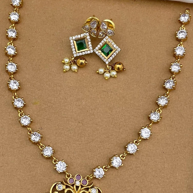 This Eye-catchy Jewellery features a central pendant with a square ruby,emerald or white AD stone,surrounded by intricate floral or temple-inspired patterns often with matching earrings gives complete look to any festivity and outfits.