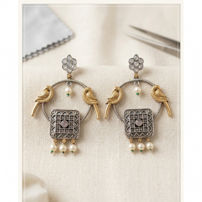 Add a touch of artistic elegance to your jewellery collection with these beautifully crafted oxidised earrings. Featuring a unique dual bird motif perched on a circular hoop, these earrings blend traditional charm with a modern boho aesthetic. The intricate square panel with turquoise stones and delicate pearl drops enhances their graceful appeal.