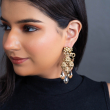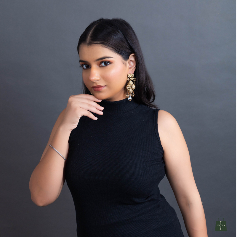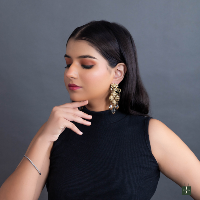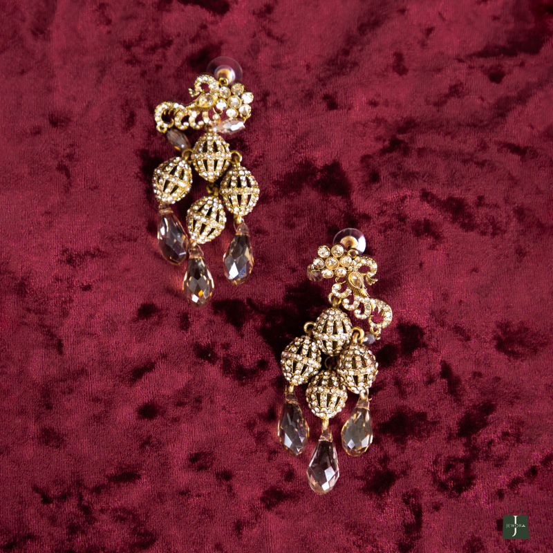 Elevate your elegance with the Aurea Drop Earrings, crafted from premium-quality alloy with a lustrous gold plating. Featuring a chandelier-style design with intricate filigree patterns and dangling crystal-like teardrops, these earrings add a glamorous finish to any ensemble.