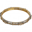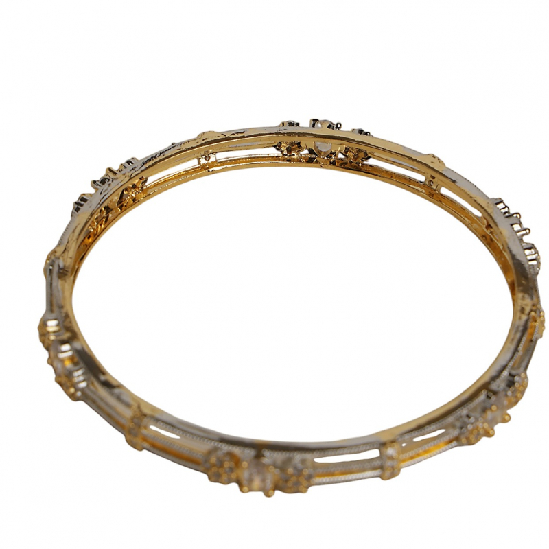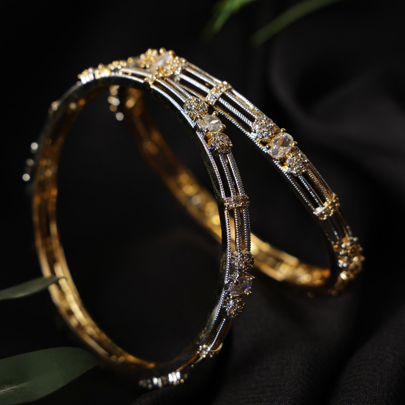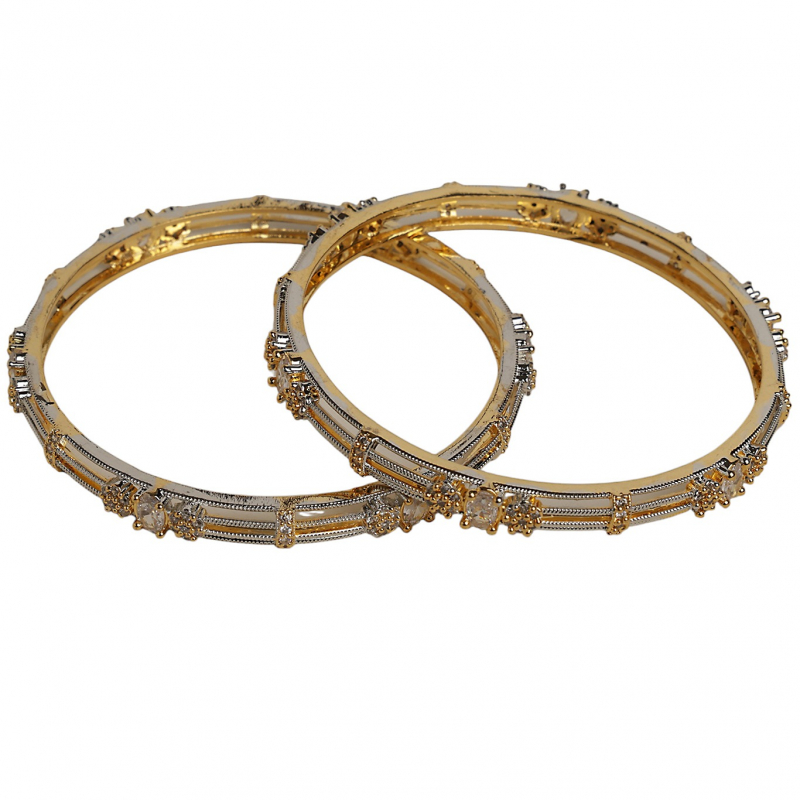 Elevate your style with this sophisticated dual-tone kada set, featuring a stunning blend of gold and silver finishes. Designed with delicate linear patterns and adorned with shimmering crystal stones, these bangles bring together modern elegance and timeless charm. Perfect for both everyday wear and special occasions, they add a subtle sparkle to any outfit.