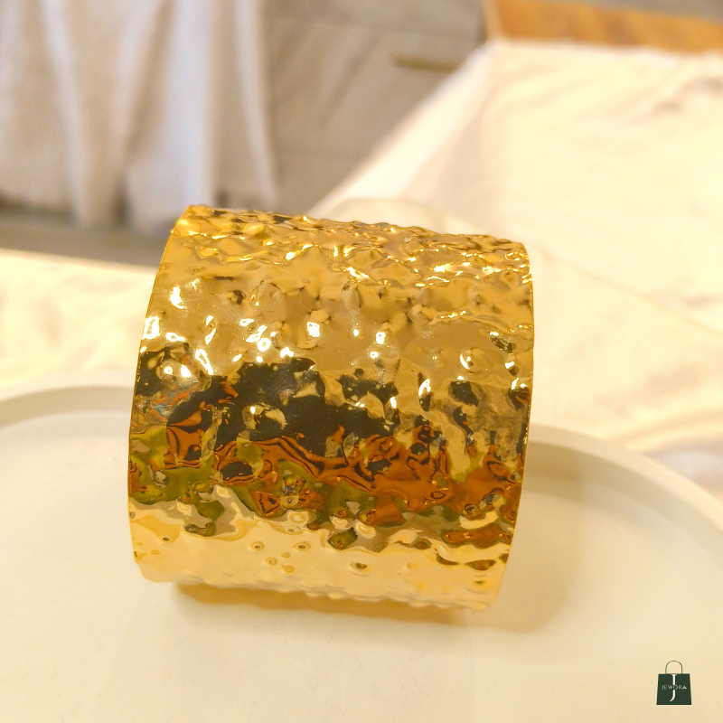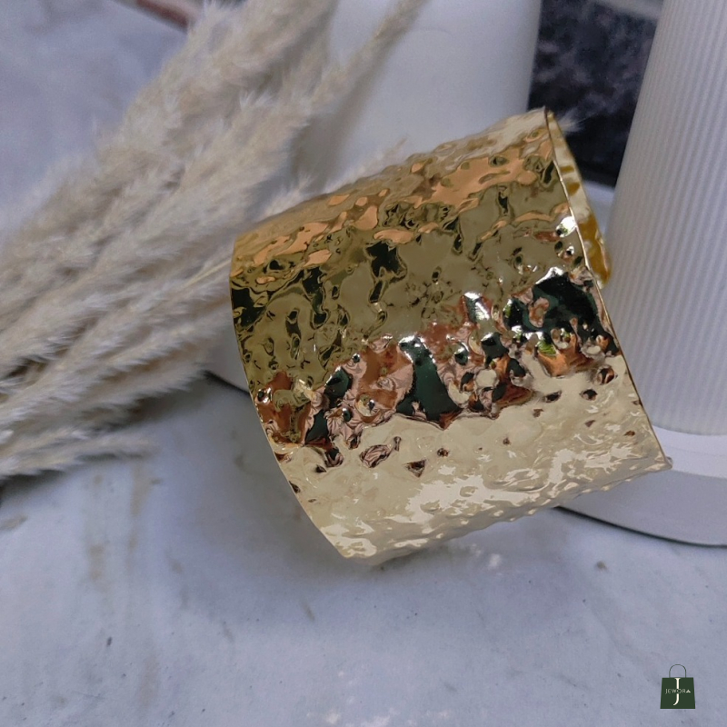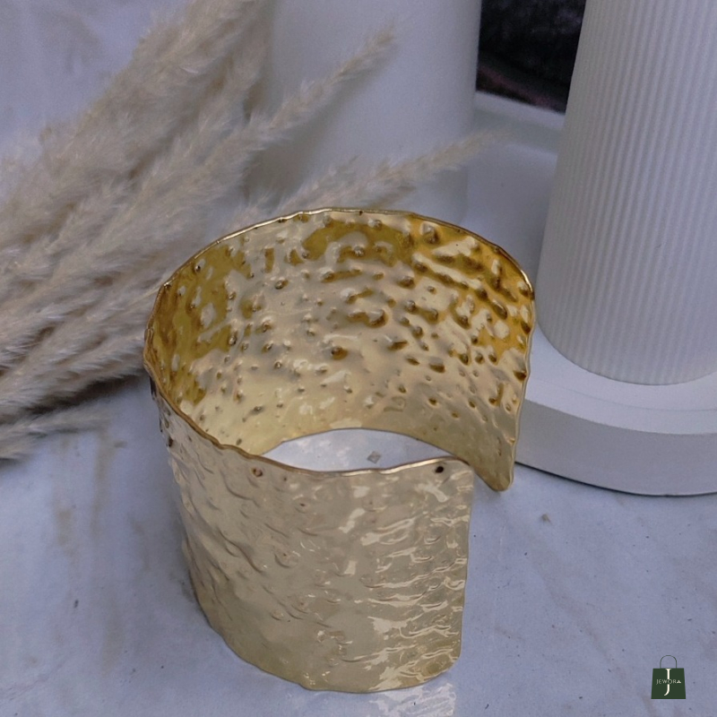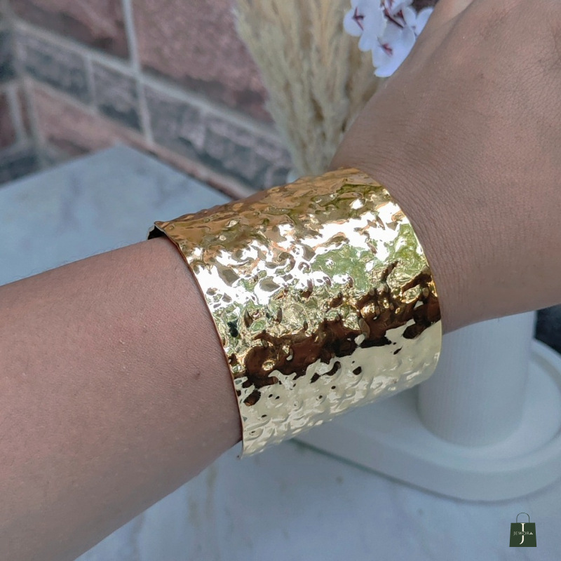 The Aurelia Hammered Gold Cuff Bracelet is a sleek and contemporary statement piece designed for effortless elegance. Crafted with a wide band and finished in a luxurious hammered texture, this cuff reflects light beautifully, creating a rich and premium look. Its minimalist yet bold design makes it perfect for both everyday wear and special occasions. Whether paired with ethnic outfits or modern western ensembles, this bracelet adds a touch of sophistication and power to your style.