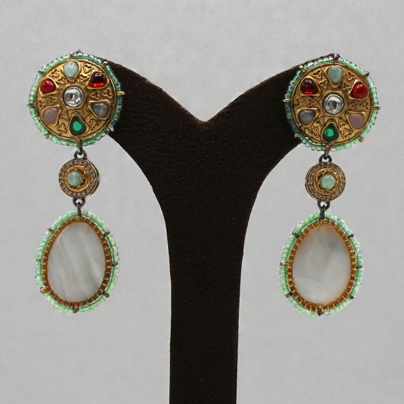 Make a bold yet elegant statement with the Aurelia Mosaic Drop Earrings. These beautifully handcrafted earrings feature a round antique gold stud decorated with vibrant multicolor stones arranged in a mosaic pattern. A delicate connector element leads to a stunning oval mother-of-pearl drop, framed with fine mint green bead detailing.