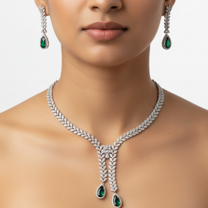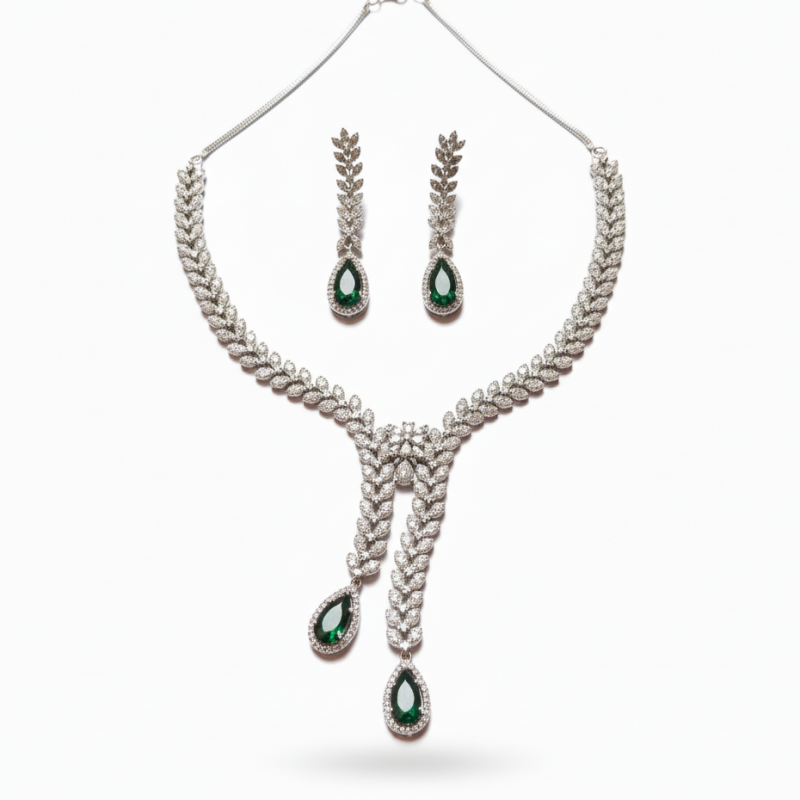 Exude timeless glamour with the Aurelia Ocean Teardrop Diamond Necklace Set. Designed in a radiant silver-tone finish, this statement set features intricate leaf-pattern cubic zirconia work forming a graceful V-shaped silhouette. The centerpiece flows into elegant cascading strands adorned with sparkling CZ stones and mesmerizing aqua blue teardrop accents.
