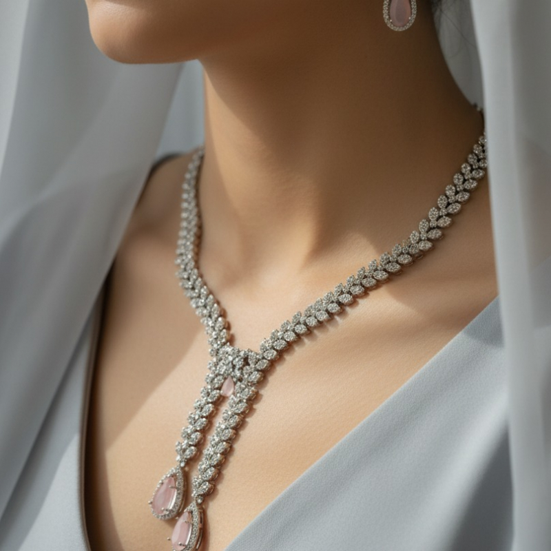 Exude timeless glamour with the Aurelia Ocean Teardrop Diamond Necklace Set. Designed in a radiant silver-tone finish, this statement set features intricate leaf-pattern cubic zirconia work forming a graceful V-shaped silhouette. The centerpiece flows into elegant cascading strands adorned with sparkling CZ stones and mesmerizing aqua blue teardrop accents.