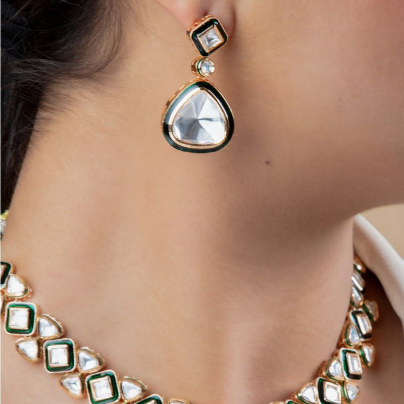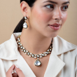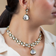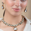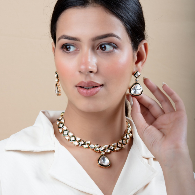 The jewelry in this image features a Kundan and Pearl Necklace Set with matching earrings, exuding elegance and traditional craftsmanship.he necklace has rounded Kundan stones set in gold, with a teardrop-shaped pendant at the center.