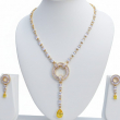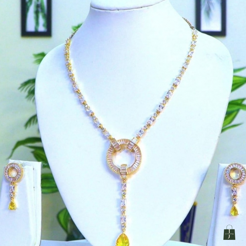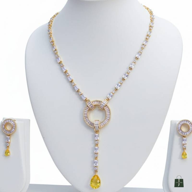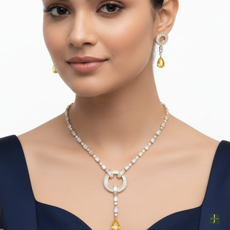 A graceful vertical drop finished with a vibrant yellow pear-shaped stone adds warmth, contrast, and regal charm. The matching earrings mirror the circular halo and golden drop motif, completing this sophisticated ensemble perfect for weddings, receptions, festive celebrations, and formal evenings.