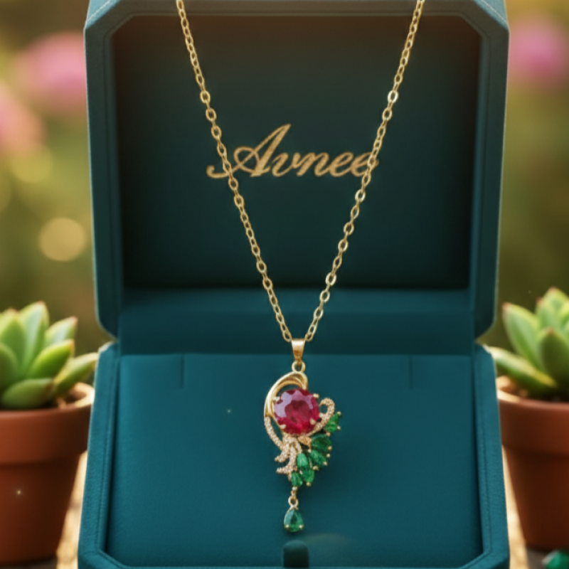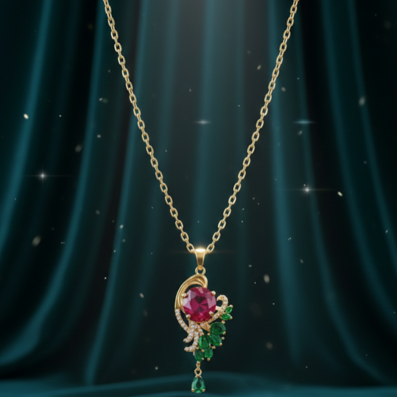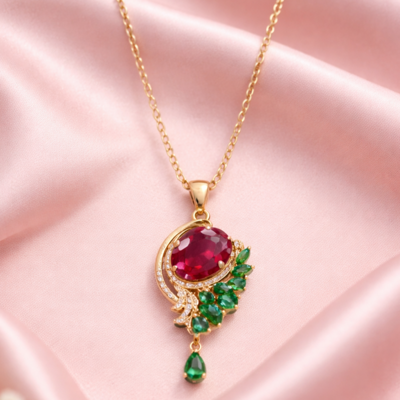 Designed to capture timeless femininity, this exquisite piece features a radiant ruby-toned center stone, delicately framed in a soft gold-finish crescent. Accented with emerald-inspired leaf detailing and fine crystal embellishments, the pendant beautifully blends classic charm with modern sophistication.