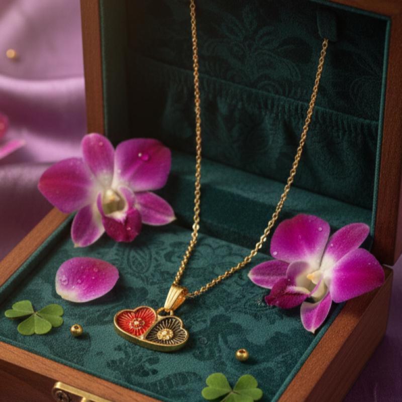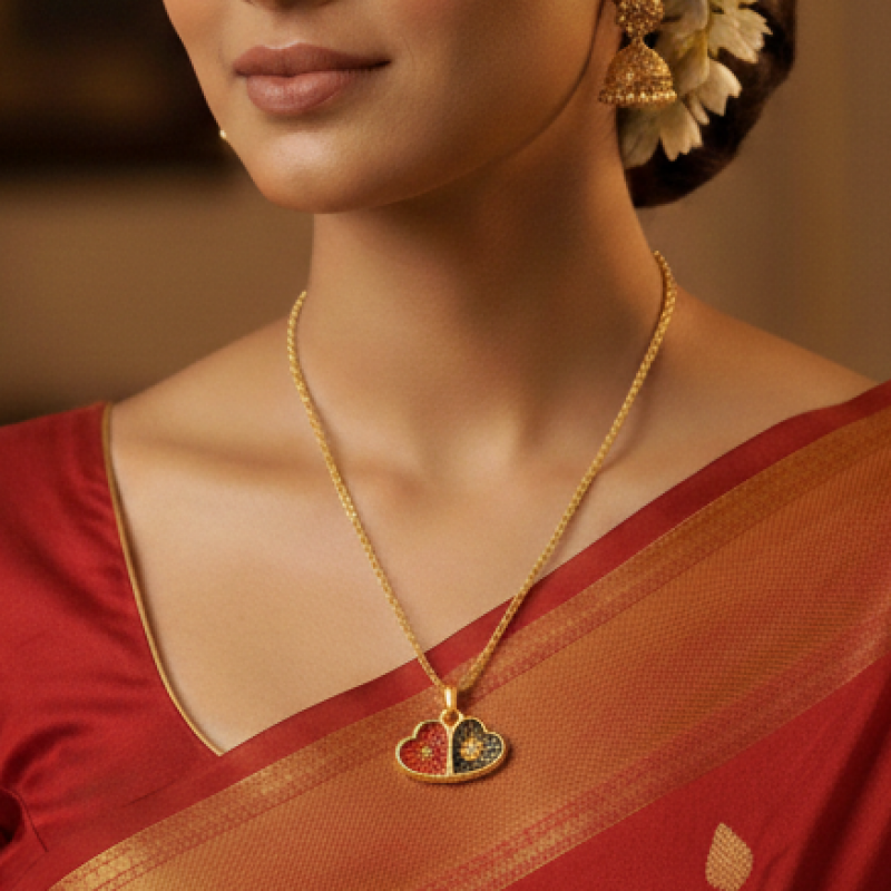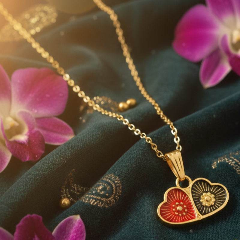 A charming dual heart pendant featuring intricate textured detailing with vibrant enamel accents. Symbolizing love and togetherness, this elegant piece is perfect for everyday wear, gifting, and special occasions. Lightweight and easy to style with both ethnic and western outfits.