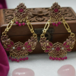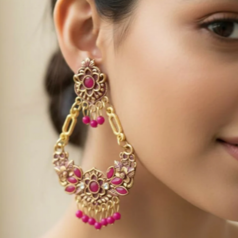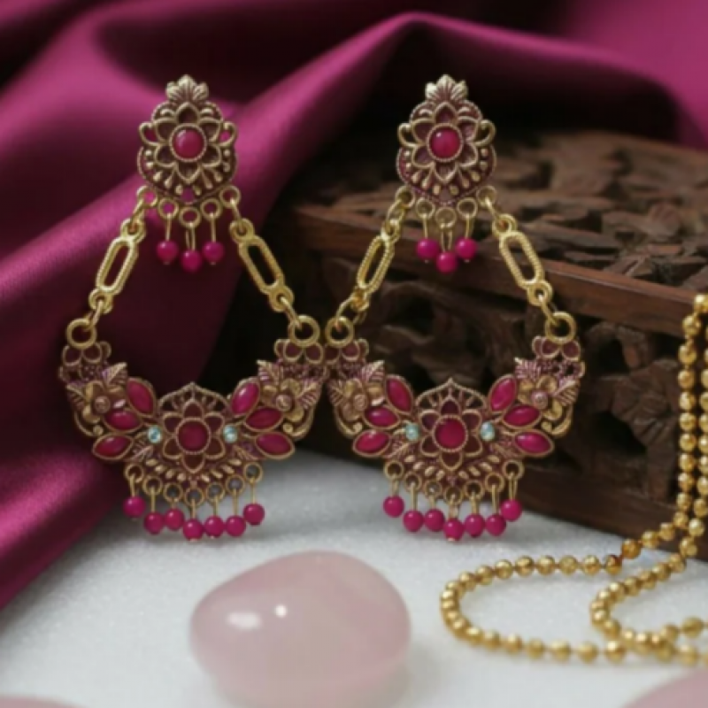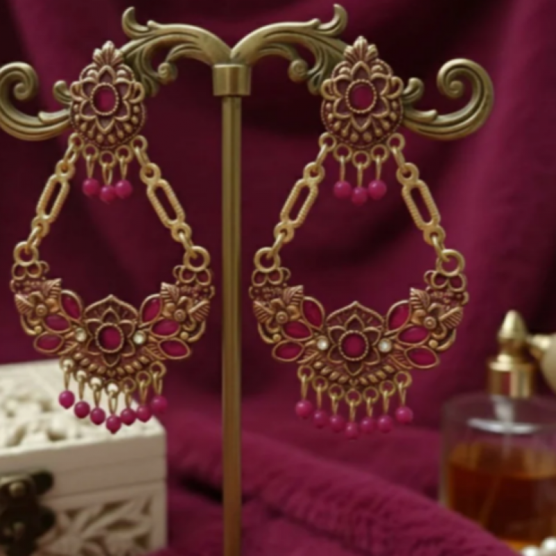 Traditional chandelier-style earrings featuring intricate detailing with green stone accents and delicate bead drops. Designed to complement ethnic and festive attire, these statement earrings add a rich, classic touch to your overall look.
