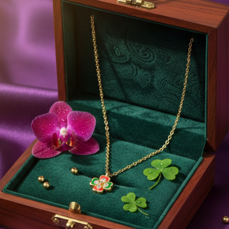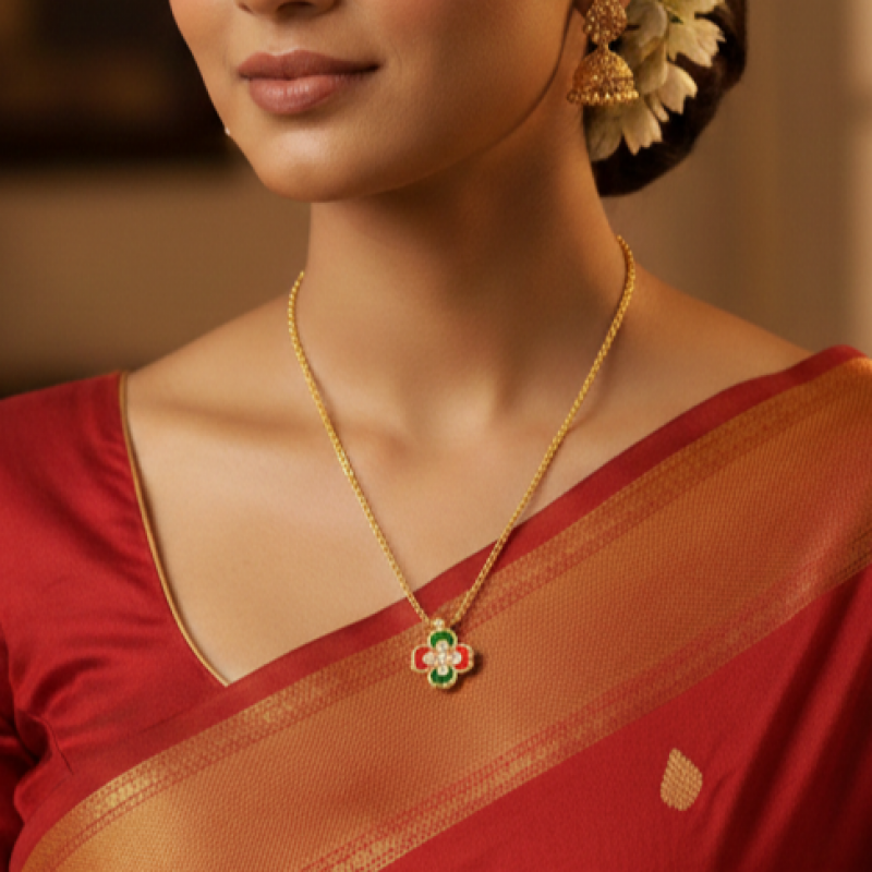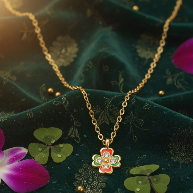 A delicate pendant featuring a charming floral design accented with vibrant enamel detailing and sparkling stones at the center. Elegant and lightweight, this piece adds a subtle touch of color and grace to everyday and festive looks.