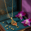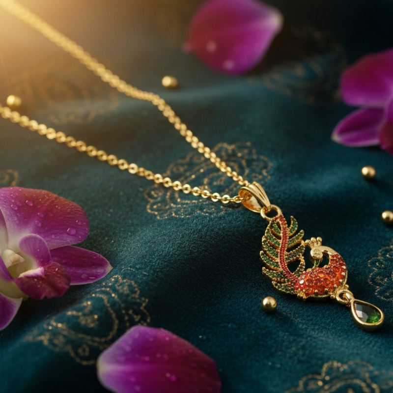 An elegant pendant featuring a swan-inspired motif with intricate detailing and vibrant bead accents. Finished with a delicate drop element at the base, this piece beautifully blends traditional artistry with graceful charm. Ideal for festive occasions, ethnic wear, and statement styling.