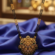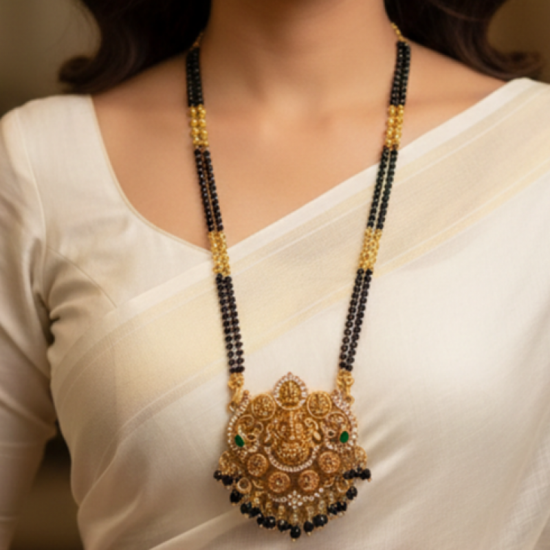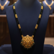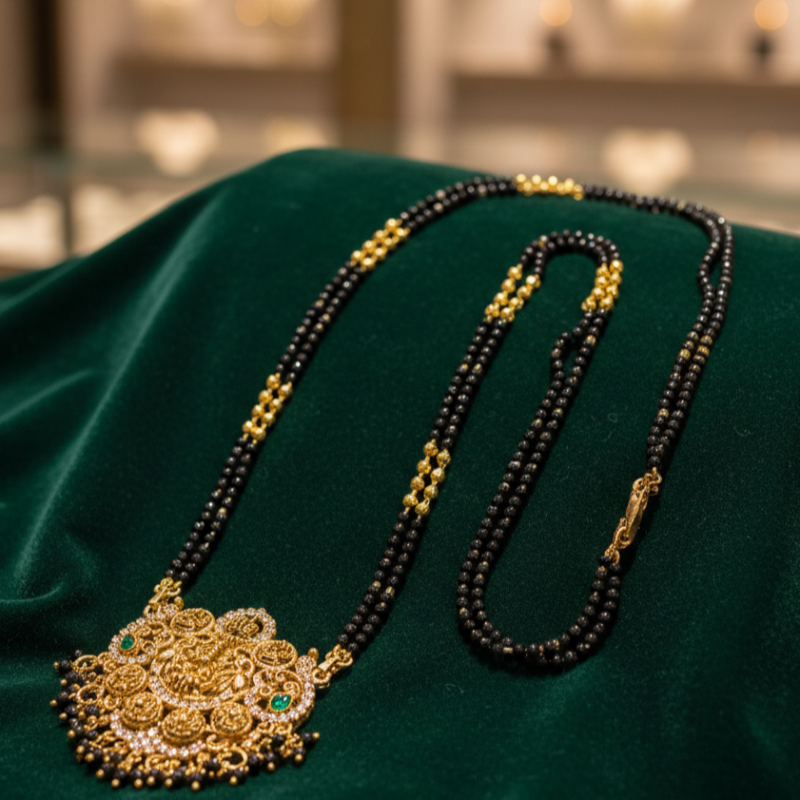 Celebrate tradition with timeless elegance. This exquisite mangalsutra features classic black bead strands accented with delicate gold detailing, paired with a grand temple-inspired pendant crafted in rich gold tones. The intricately carved pendant showcases traditional motifs with fine craftsmanship, making it a perfect blend of heritage and modern sophistication. Designed to elevate everyday grace or festive attire, this piece embodies strength, commitment, and feminine power. A statement of tradition. A symbol of love. A touch of royalty.