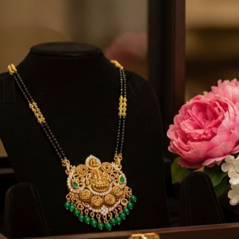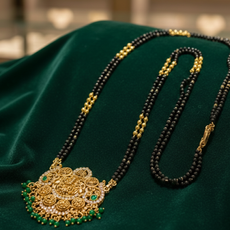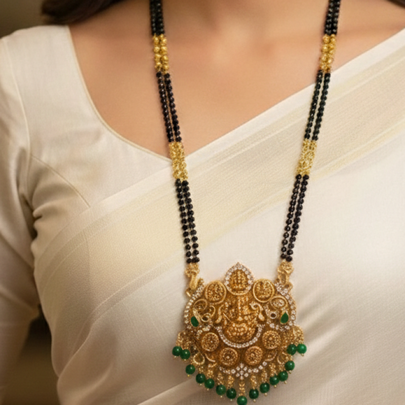 Celebrate tradition with timeless elegance. This exquisite mangalsutra features classic black bead strands accented with delicate gold detailing, paired with a grand temple-inspired pendant crafted in rich gold tones. The intricately carved pendant showcases traditional motifs with fine craftsmanship, making it a perfect blend of heritage and modern sophistication. Designed to elevate everyday grace or festive attire, this piece embodies strength, commitment, and feminine power. A statement of tradition. A symbol of love. A touch of royalty.