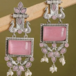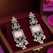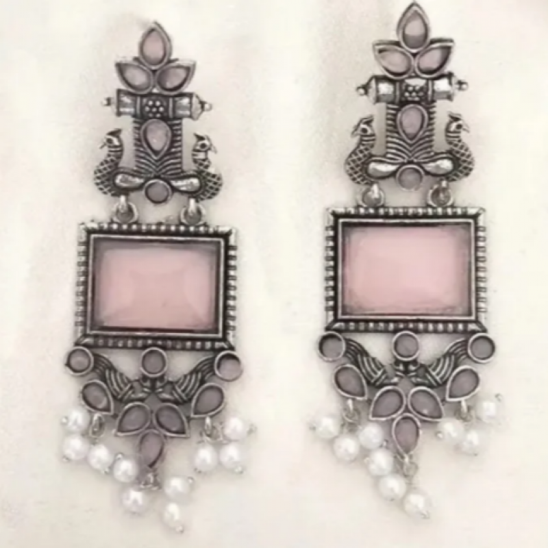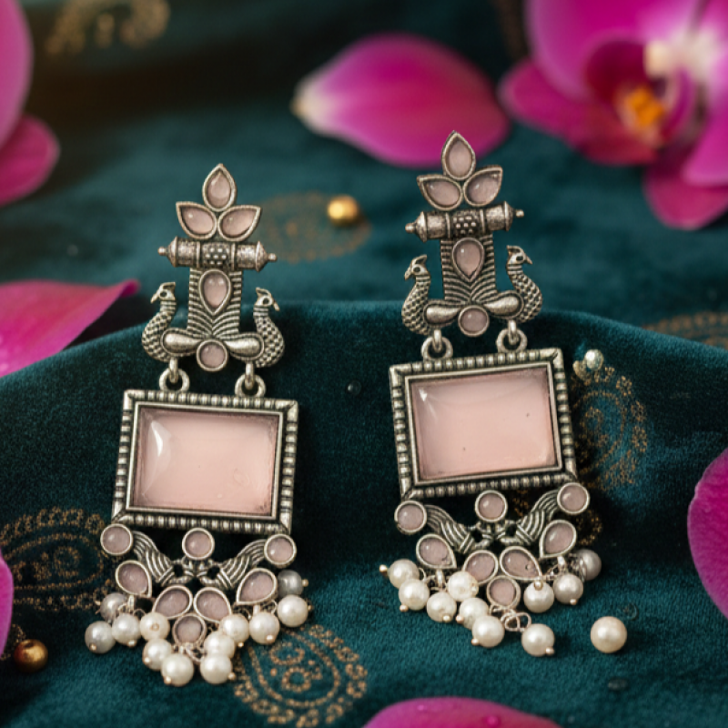 Elegant oxidized silver earrings featuring rectangular blue stones with intricate traditional detailing. Accented with floral elements and delicate pearl drops, these statement earrings add a graceful ethnic touch to festive and everyday styling.