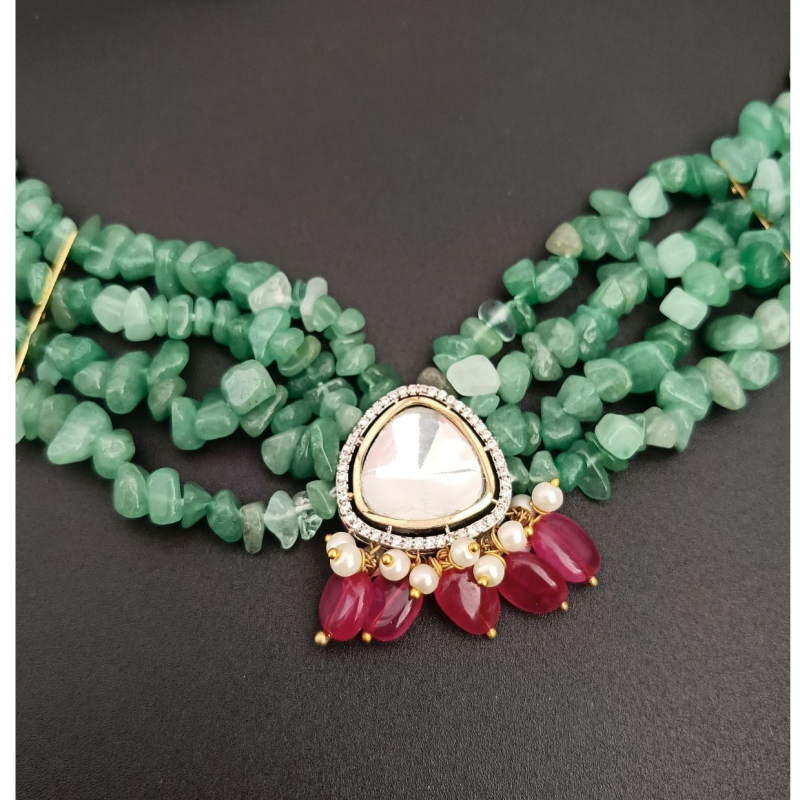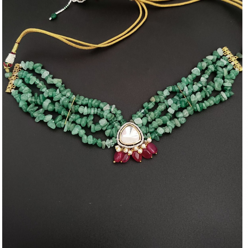 The multi-strand layout creates a rich, layered look that sits gracefully on the neckline, while the adjustable closure ensures a comfortable and perfect fit. Each necklace is truly one-of-a-kind, as every Aventurine stone carries its own natural cut, texture, and shape, making no two pieces exactly alike. This unique combination of raw gemstones and classic Kundan artistry makes the choker both contemporary and heritage-inspired.