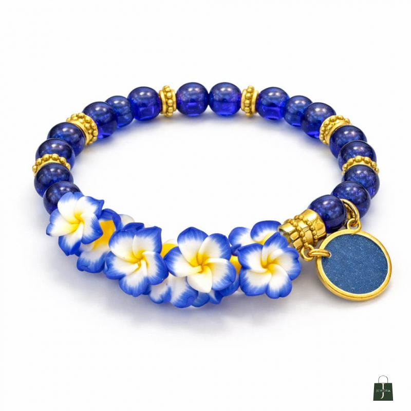A refreshing blend of deep blue beads and delicate white-blue floral accents, this bracelet captures the beauty of nature with a touch of elegance. Finished with gold-toned detailing and a subtle charm, it adds a vibrant yet graceful statement to your everyday look.